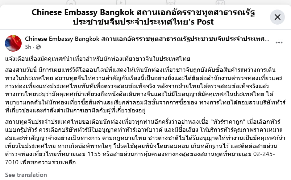 ស្ថានទូតចិន ប្រចាំទីក្រុងបាងកក បានចេញសេចក្តីព្រមានមួយកាលពីថ្ងៃអង្គារ ដោយជំរុញឱ្យអ្នកទេសចរចិនជៀសវាងទិញកញ្ចប់ទេសចរណ៍ដែលមានតម្លៃទាប បន្ទាប់ពីមានវីដេអូមួយបានបង្ហាញពីមគ្គុទ្ទេសក៍ទេសចរណ៍ដែលគំរាមកំហែងភ្ញៀវថា “នឹងទុកចោល” ប្រសិនបើពួកគេបដិសេធមិនទិញទំនិញរបស់ថៃ។ នេះបើយោងតាមប្រព័ន្ធផ្សព្វផ្សាយថៃ khaosod នៅថ្ងៃទី១៥ ខែតុលានេះ។