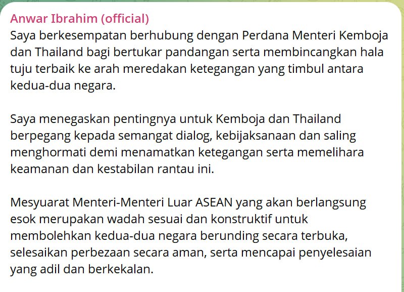 ម៉ាឡេស៊ី៖ លោក អាន់វ៉ា អ៊ីប្រាហ៊ីម នាយករដ្ឋមន្ត្រីម៉ាឡេស៊ី ជាប្រធានអាស៊ាន នៅព្រឹកថ្ងៃអាទិត្យ ទី២១ ខែធ្នូនេះ បានបញ្ជាក់លើបណ្តាញទំនាក់ទំនងសង្គមផ្លូវការថា “កិច្ចពិភាក្សារវាងកម្ពុជា និងថៃ គឺជាជំហានសំខាន់ក្នុងការកាត់បន្ថយភាពតានតឹង និងថែរក្សាសន្តិភាពក្នុងតំបន់”។
