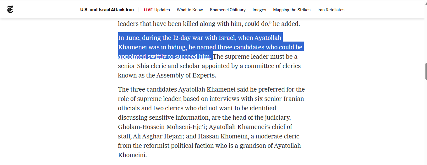 តាមប្រភពពី New York Time បានឲ្យដឹងថា ក្នុងខែមិថុនា អំឡុងពេលជាប់ដៃធ្វើសង្រ្គាម ១២ថ្ងៃជាមួយអ៊ីស្រាអែល នៅក្រោយការលាក់ខ្លួនរបស់ លោក Ayatollah Khamenei គាត់បានដាក់ឈ្មោះបេក្ខជនបីនាក់រួចជាស្រេច ដែលនឹងត្រូវបានតែងតាំងយ៉ាងរហ័ស ដើម្បីស្នងតំណែងរបស់គាត់។ លក្ខខណ្ឌនៃការតែងតាំង មេដឹកនាំកំពូលជំនាន់ក្រោយត្រូវតែជាបព្វជិតនិកាយ Shia ជាន់ខ្ពស់ និងជាអ្នកប្រាជ្ញដែលត្រូវបានតែងតាំងដោយគណៈកម្មាធិការបព្វជិត។