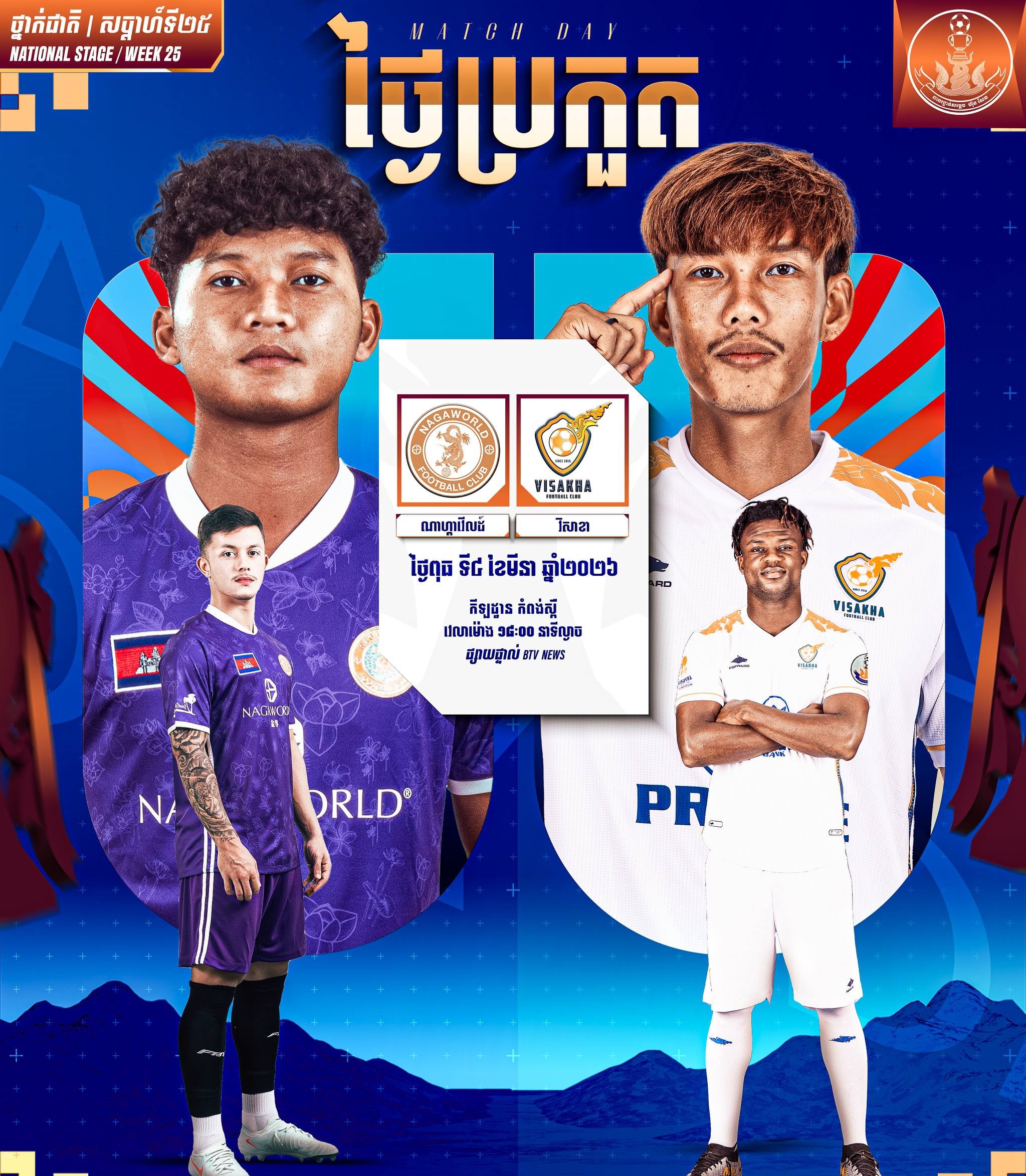 គូទី ១ ក្រុម កងយោធពលខេមរភូមិន្ទ នឹងត្រូវបើកទ្វាកីឡដ្ឋានស្តាតចាស់របស់ខ្លួនទទួលស្វាគមន៍ក្រុមភ្ញៀវ បឹងកេត។ ចំណែកមួយគូទៀត ក្រុម ណាហ្គាវើលដ៍ ត្រូវបើកទ្វាកីឡដ្ឋាន កំពង់ស្ពឺ របស់ខ្លួនទទួលស្វាគមន៍ក្រុម វិសាខា វេលាម៉ោង ៦ ល្ងាចដូចគ្នា។