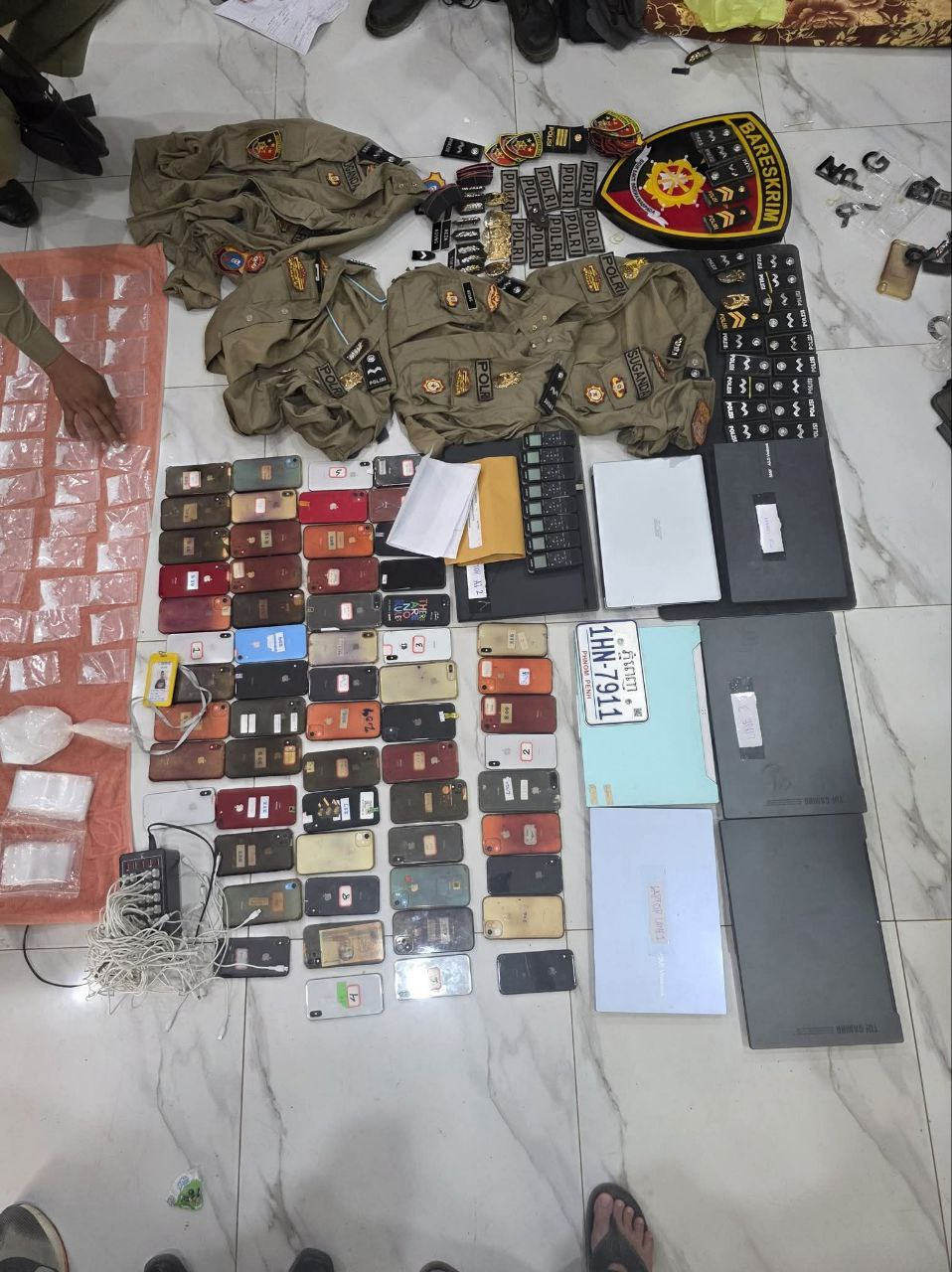 វត្ថុតាងដកហូតរួមមាន៖ ទូរសព្ទដៃ ៥៩គ្រឿង, ឧបករណ៍ថតសម្លេង ០៨ គ្រឿង, កុំព្យូទ័រឡេបថប ០៧ គ្រឿង, ឯកសណ្ឋាននគរបាលឥណ្ឌូនេស៊ី (អាវ ៤ និងសម្ភារៈពាក់ព័ន្ធ), សារធាតុសង្ស័យជាគ្រឿងញៀន ចំនួន ៥៩ កញ្ចប់តូច និង ០១កញ្ចប់ធំ។