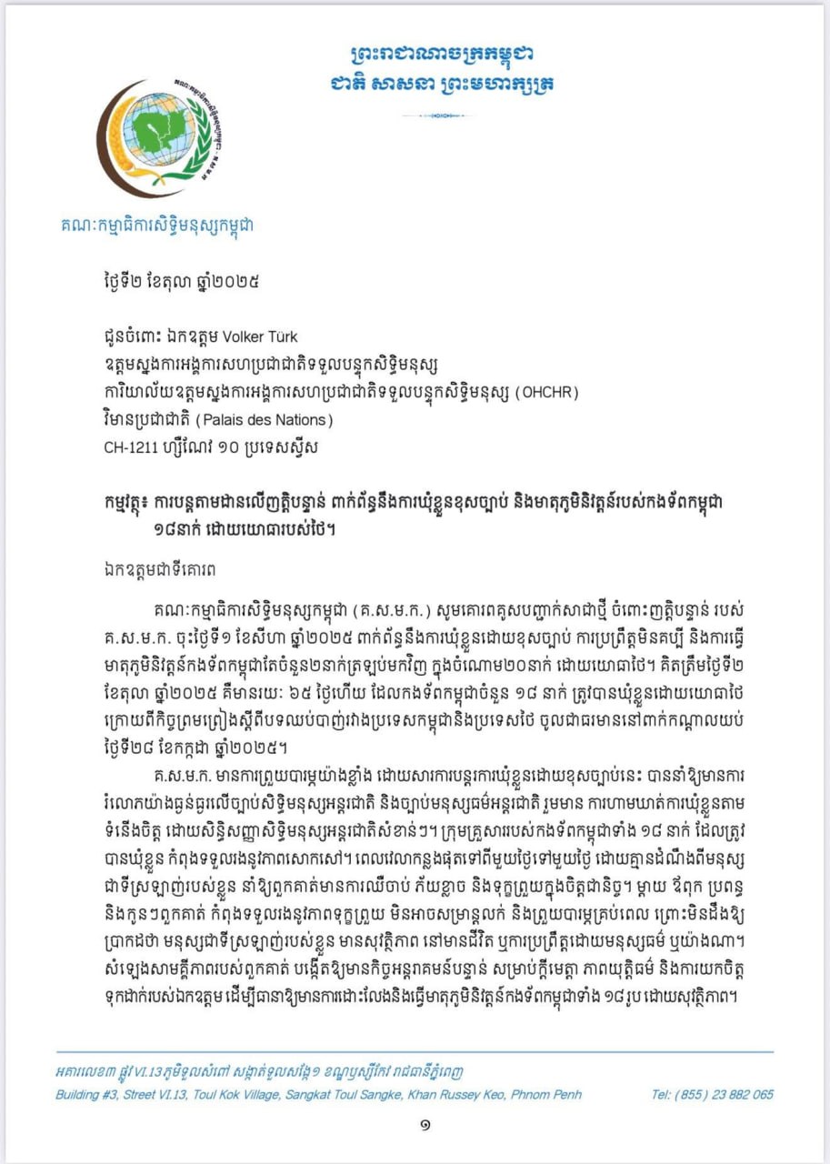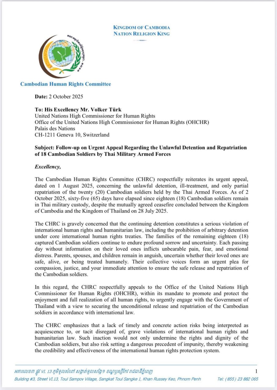 គណៈកម្មាធិការសិទ្ធិមនុស្សកម្ពុជា (គ.ស.ម.ក.) បានគូសបញ្ជាក់សាជាថ្មីថា «ចំពោះញត្តិបន្ទាន់ របស់ គ.ស.ម.ក. ចុះថ្ងៃទី០១ ខែសីហា ឆ្នាំ២០២៥ ពាក់ព័ន្ធនឹងការឃុំខ្លួនដោយខុសច្បាប់ ការប្រព្រឹត្តមិនគប្បី និងការធ្វើ មាតុភូមិនិវត្តន៍កងទ័ពកម្ពុជាតែ ចំនួន ០២ នាក់ ត្រឡប់មកវិញ ក្នុងចំណោម២០នាក់ ដោយយោធាថៃ។ គិតត្រឹមថ្ងៃទី០២ ខែតុលា ឆ្នាំ២០២៥ គឺមានរយៈ ៦៥ ថ្ងៃហើយ ដែលកងទ័ពកម្ពុជា ចំនួន ១៨ នាក់ ត្រូវបានឃុំខ្លួនដោយយោធាថៃ ក្រោយពីកិច្ចព្រមព្រៀងស្តីពី បទឈប់បាញ់ រវាងប្រទេសកម្ពុជា និងប្រទេសថៃ ចូលជាធរមាននៅពាក់កណ្តាលយប់ ថ្ងៃទី២៨ ខែកក្កដា ឆ្នាំ២០២៥»។