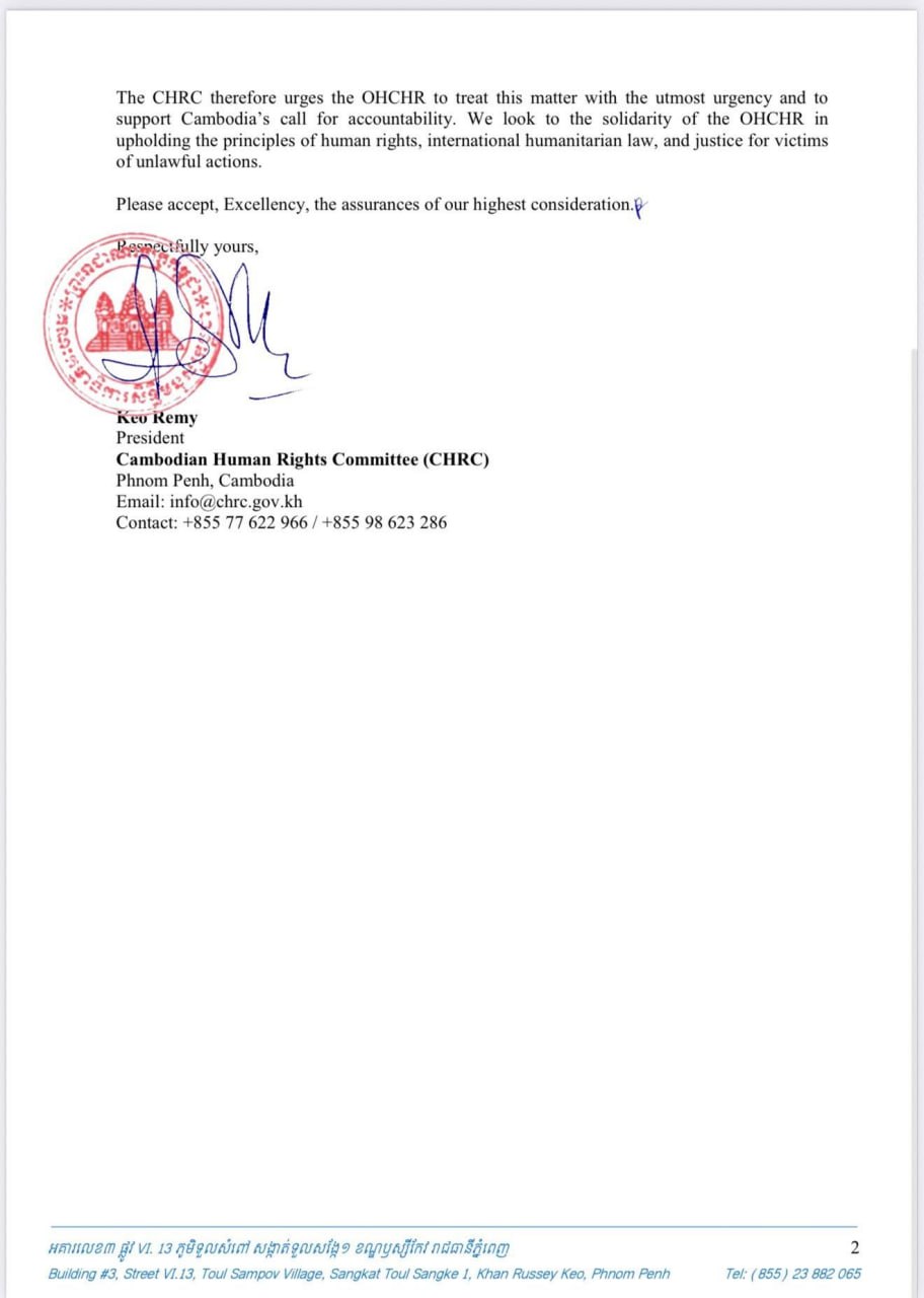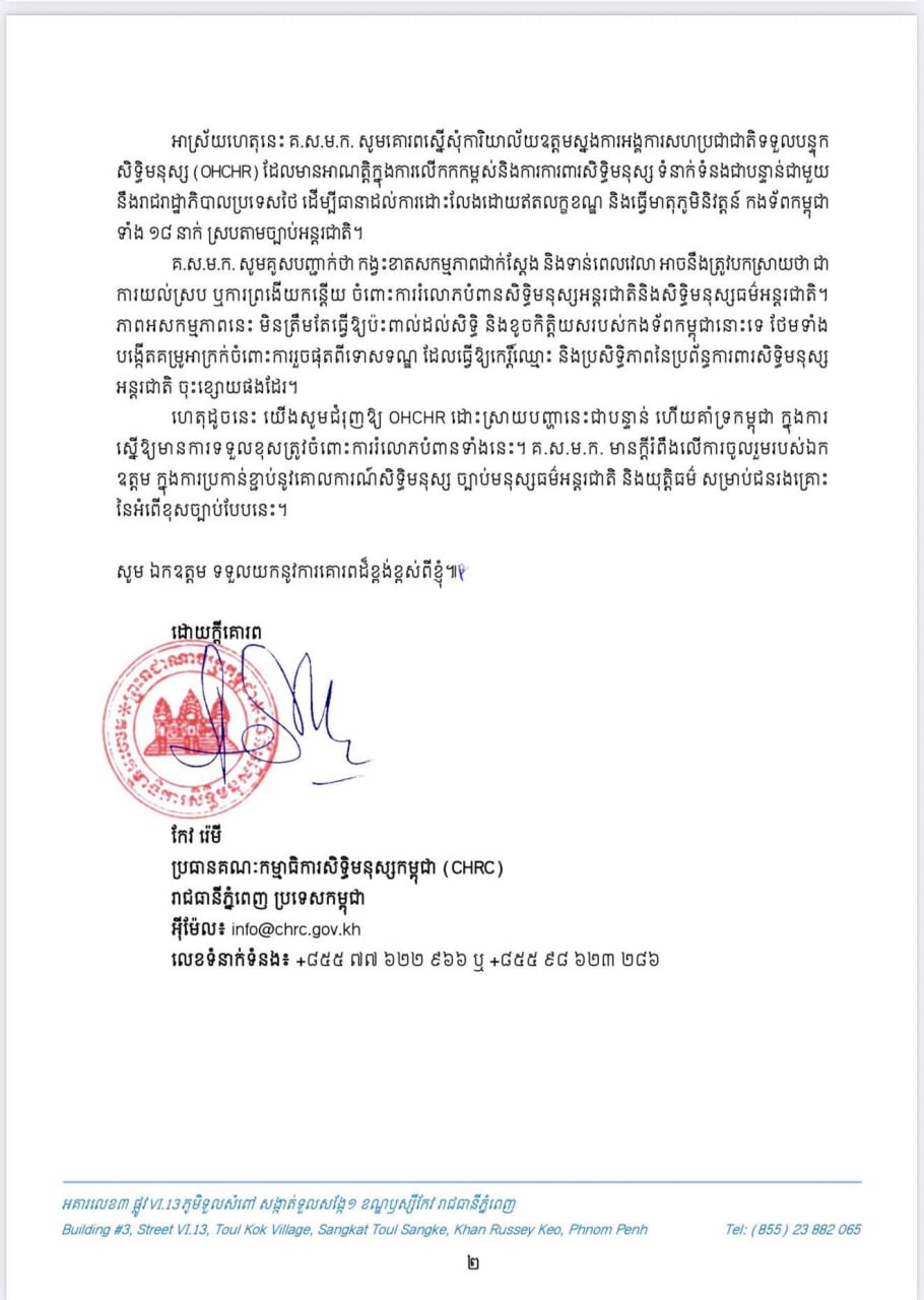ហេតុដូចនេះ យើងសូមជំរុញឱ្យ «OHCHR» ដោះស្រាយបញ្ហានេះជាបន្ទាន់ ហើយគាំទ្រកម្ពុជា ក្នុងការស្នើឱ្យមានការទទួលខុសត្រូវចំពោះការរំលោភបំពានទាំងនេះ។ គ.ស.ម.ក. មានក្តីរំពឹងលើការចូលរួមរបស់លោកក្នុងការប្រកាន់ខ្ជាប់នូវគោលការណ៍សិទ្ធិមនុស្ស ច្បាប់មនុស្សធម៌អន្តរជាតិ និងយុត្តិធម៌ សម្រាប់ជនរងគ្រោះ នៃអំពើខុសច្បាប់បែបនេះ៕