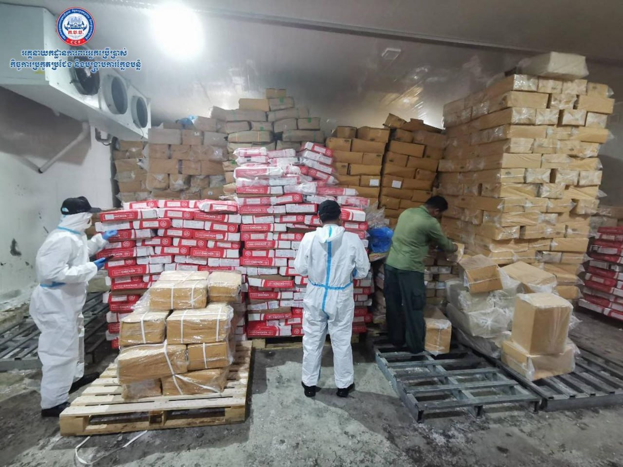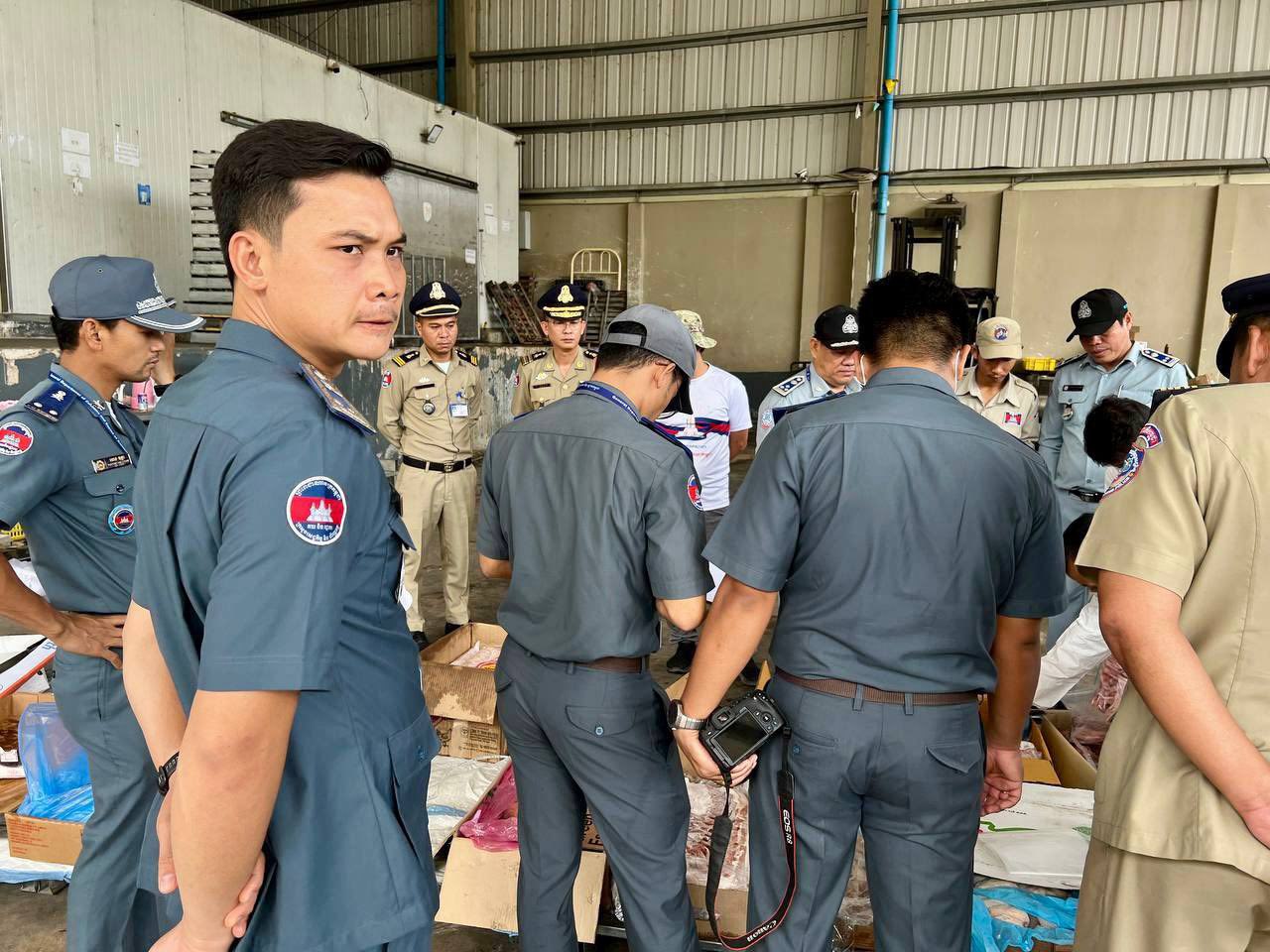 ភ្នំពេញ៖ កម្លាំងសមត្ថកិច្ចចម្រុះចុះប្រតិបត្តិការការពិនិត្យឃ្លាំងស្តុកទំនិញរបស់ ចែទូច ដែលមានងារជា «ឧកញ៉ា» មានប្តីជាស្នងការនគរបាលខេត្តជាប់ព្រំដែន បានរកឃើញសាច់បង្កកក្លាសេរាប់សិបតោន ខណៈមន្ត្រីជំនាញថា «បង់ពន្ធត្រឹមត្រូវ និងគ្មានផ្ទុកសារធាតុគីមី»។