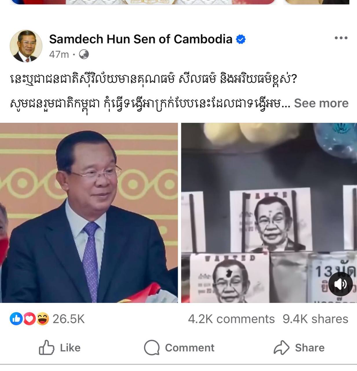 ភ្នំពេញ៖ លោកឧបនាយករដ្ឋមន្រ្តី ហ៊ុន ម៉ានី រដ្ឋមន្ត្រីក្រសួងមុខងារសាធារណៈ និងជាប្រធានសភាពសហព័ន្ធយុវជនកម្ពុជា នៅរសៀលថ្ងៃចន្ទ ទី០៦ ខែតុលានេះ បានលើកឡើងថា៖ «កម្ពុជា តែងប្រកាន់ជំហររកដំណោះស្រាយដើម្បីស្វែងរកសន្តិភាព ដើម្បីប្រទេសទាំងពីរ និងប្រជាជនទាំងសងខាង។ ប៉ុន្តែ នេះជាទង្វើដ៏អសីលធម៌ គ្មានគុណធម៌ មិនសាកសមជាប្រជាជនស៊ីវិល័យនោះទេ»។