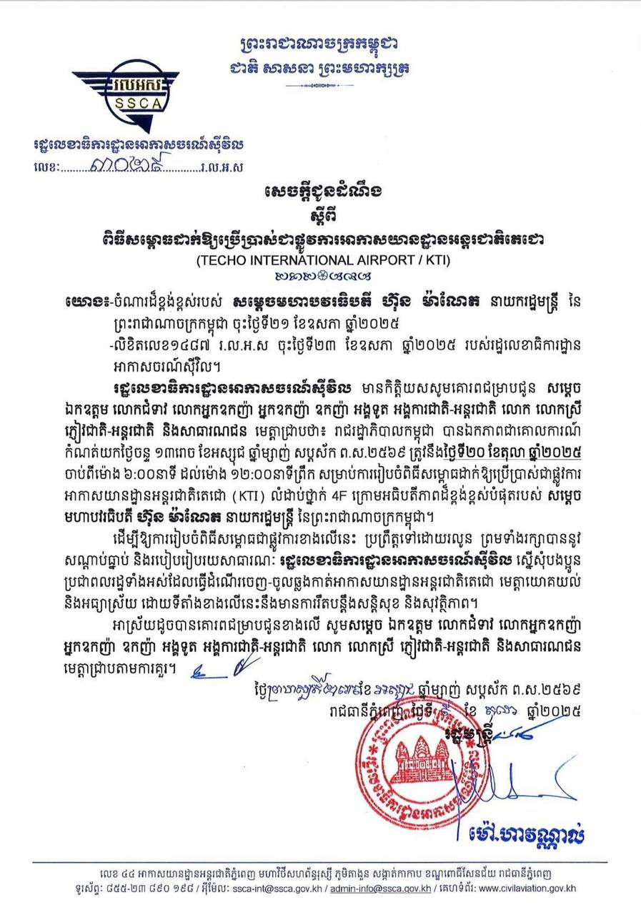 រដ្ឋលេខាធិការដ្ឋានអាកាសចរណ៍ស៊ីវិល បានឱ្យដឹងថា រាជរដ្ឋាភិបាលកម្ពុជា បានឯកភាពជាគោលការណ៍កំណត់យកថ្ងៃចន្ទ ទី២០ ខែតុលា ឆ្នាំ២០២៥ ចាប់ពីម៉ោង ០៦និង០០នាទី ដល់ម៉ោង ១២និង០០នាទីព្រឹក សម្រាប់ការរៀបចំពិធីសម្ពោធដាក់ឱ្យប្រើប្រាស់ជាផ្លូវការ អាកាសយានដ្ឋានអន្តរជាតិតេជោ (KTI) លំដាប់ថ្នាក់ 4Fនេះ។