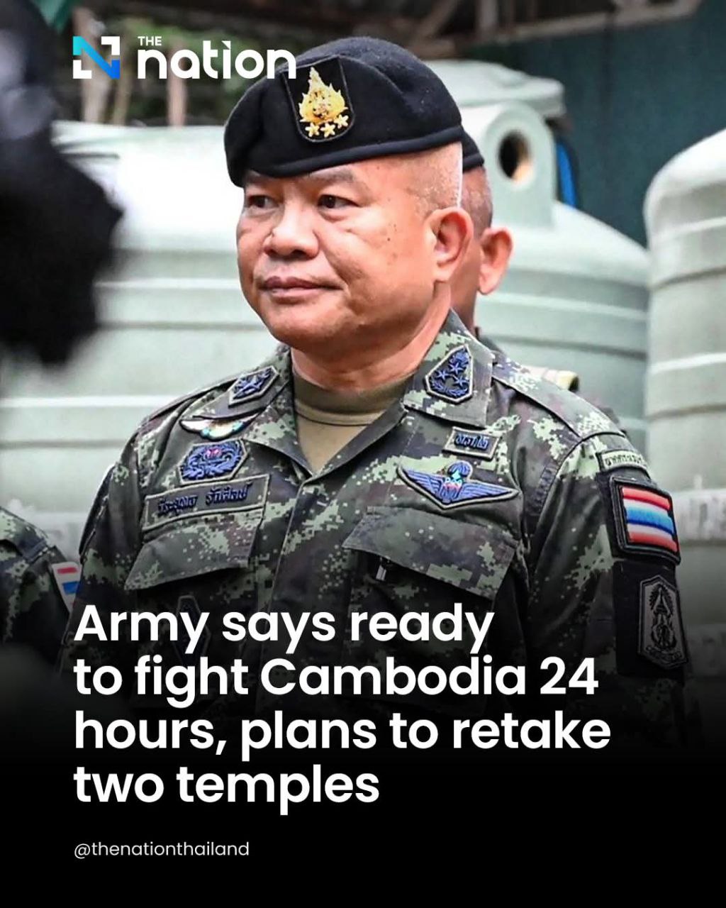 ថៃ៖ ឧត្តមសេនីយ Weerayut កងទ័ពទី២ ថៃថ្មី ប្រកាសក្ដែងៗយ៉ាងក្អេងក្អាងថា កងទ័ពលោក បានត្រៀមវាយកម្ពុជា ២៤ម៉ោង ដើម្បីគ្រោងដណ្តើមយកប្រាសាទចំនួនពីរមកវិញ ពោលគឺ ប្រាសាទតាក្របី និងប្រាសាទខ្នា (ខាងកើតប្រាសាទតាក្របី)។ នេះបើតាមការចេញផ្សាយពីកាសែតថៃ The Nation នៅថ្ងៃទី១៣ តុលា ឆ្នាំ២០២៥។