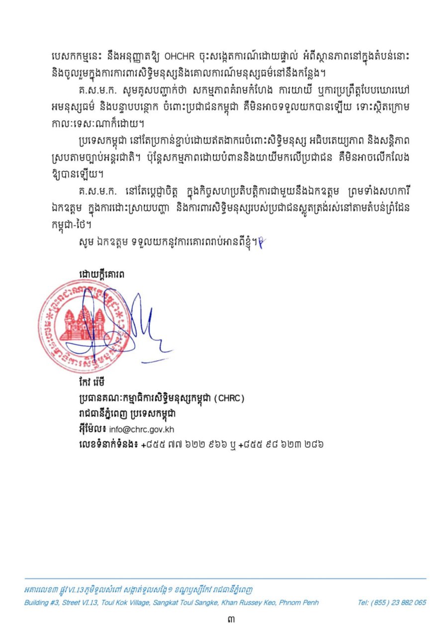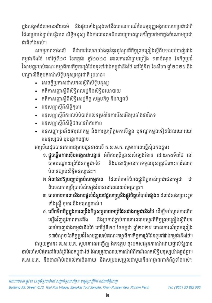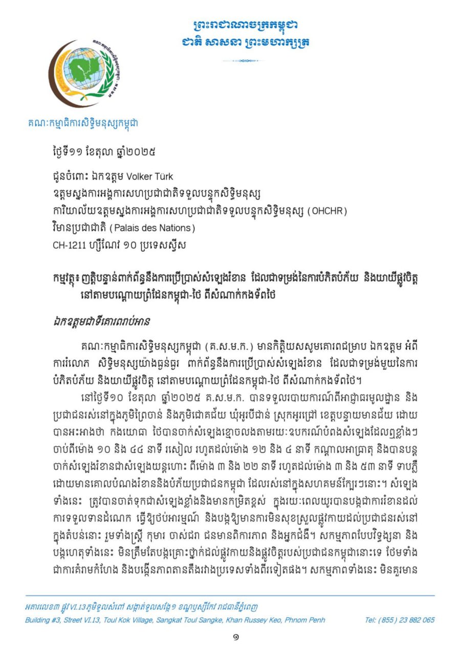សូមបញ្ជាក់ថា គណៈកម្មាធិការសិទ្ធិមនុស្សកម្ពុជា បានអំពាវនាវជាផ្លូវការទៅកាន់ឧត្តមស្នងការអង្គការសហប្រជាជាតិទទួលបន្ទុកសិទ្ធិមនុស្ស «OHCHR» ឲ្យធ្វើការស៊ើបអង្កេតលើករណីភាគីថៃ ប្រើប្រាប់ឧបករណ៍បំពងសំឡេងចាក់សំឡេងខ្មោច ឆ្កែព្រុស ឆ្កែលូ និងយន្តហោះរំខានប្រជាពលរដ្ឋជាជនស៊ីវិលកម្ពុជា គឺជា «ការបំភិតបំភ័យ និងការយាយីផ្លូវចិត្ត រំលោភសិទ្ធិមនុស្សធ្ងន់ធ្ងរ និងផ្ទុយពីច្បាប់អន្តរជាតិ»។