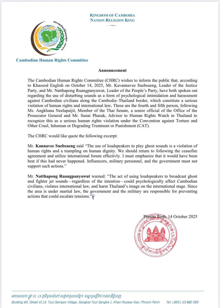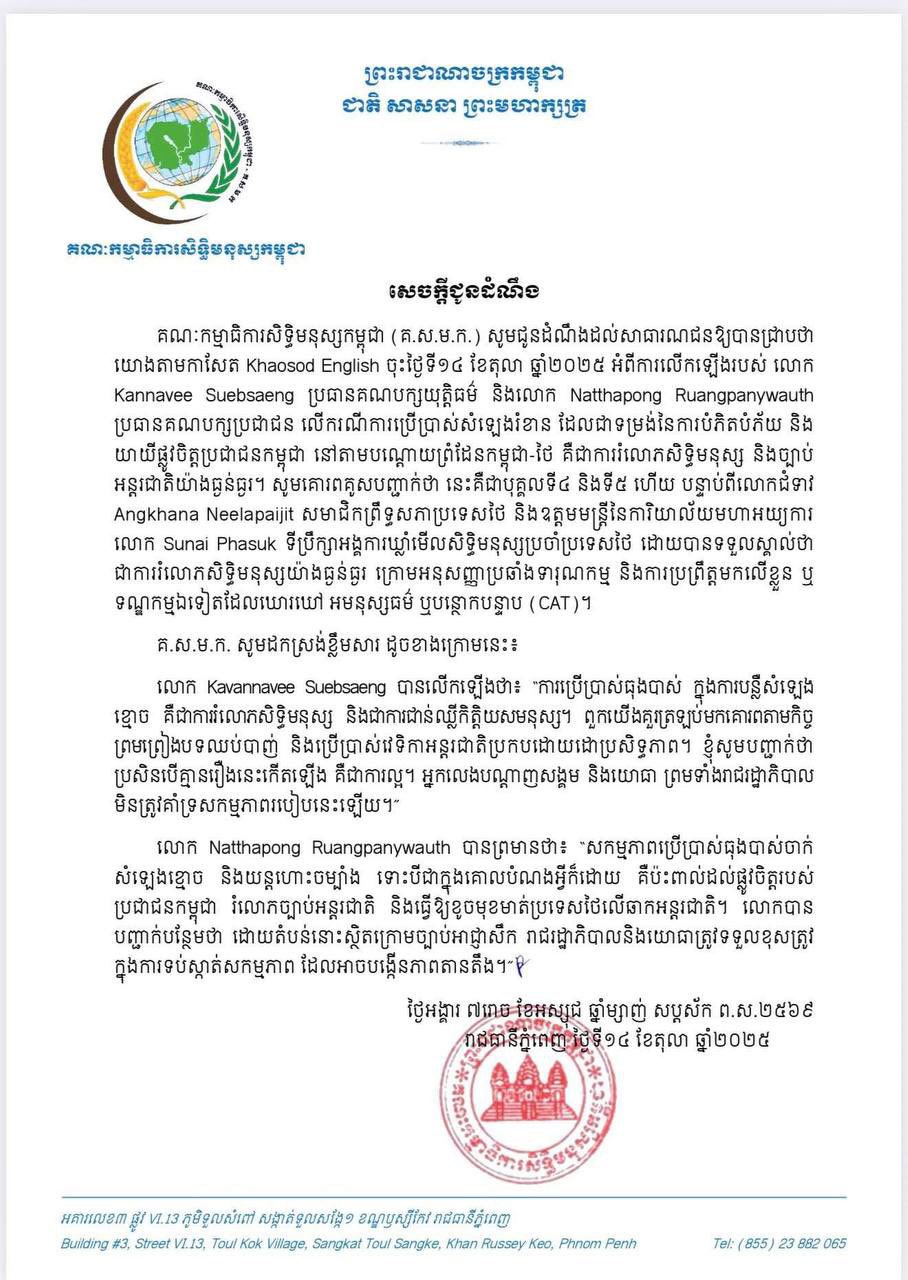 យោងតាមកាសែត Khaosod English ចុះថ្ងៃទី១៤ ខែតុលា ឆ្នាំ២០២៥ អំពីការលើកឡើង របស់ លោក Kannavee Suebsaeng ប្រធានគណបក្សយុត្តិធម៌ និងលោក Natthapong Ruangpanywauth ប្រធានគណបក្សប្រជាជន លើករណី បុគ្គលឈ្មោះ Kun Jom Palang ដែលជា Influencer ដ៏ល្បីល្បាញលើបណ្តាញសង្គម បាននាំយកឧបករណ៍សំឡេង ដើម្បីចាក់សំឡេងខ្មោច និងសំឡេងយន្តហោះចម្បាំង ដែលជាទម្រង់នៃការបំភិតបំភ័យ និងយាយីផ្លូវចិត្តប្រជាជនកម្ពុជា នៅតាមបណ្តោយព្រំដែន កម្ពុជា-ថៃ គឺជាការរំលោភសិទ្ធិមនុស្ស និងច្បាប់អន្តរជាតិយ៉ាងធ្ងន់ធ្ងរ។