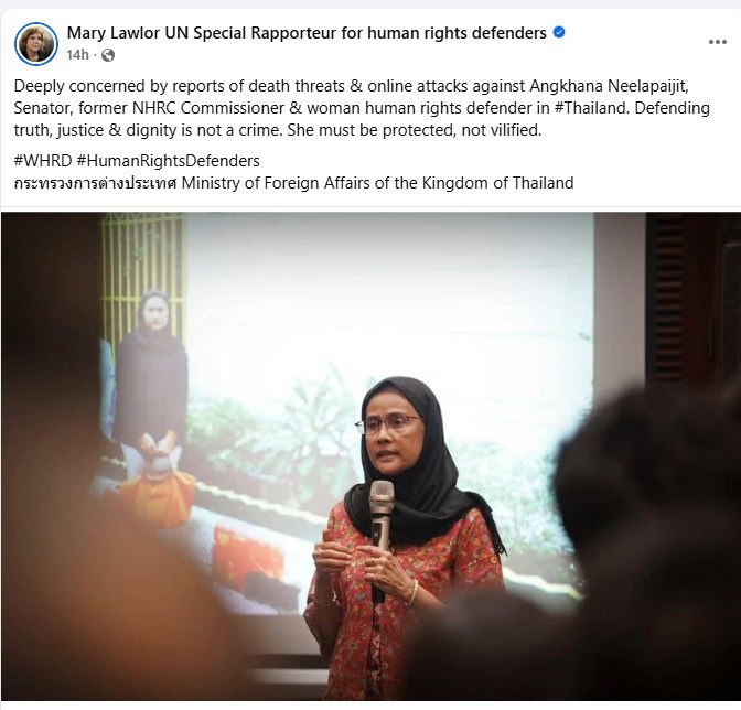 ថៃ៖ អ្នករាយការណ៍ពិសេសសិទ្ធិមនុស្សរបស់ UN សម្តែងការព្រួយបារម្ភយ៉ាងខ្លាំង «អំពីសុវត្ថិភាព» របស់សមាជិកព្រឹទ្ធសភាថៃ គឺលោកស្រី Angkhana Neelapaijit ទទួលរងការវាយប្រហារដោយពាក្យសំដី និងការធ្វើឃាតយ៉ាងធ្ងន់ធ្ងរ បន្ទាប់ពីលោកស្រីបានរិះគន់ការប្រើប្រាស់សំឡេងខ្មោចខ្លាំងៗប្រឆាំងនឹងប្រជាជនស៊ីវិលកម្ពុជា នៅភូមិព្រៃចាន់ និងភូមិជោគជ័យ ឃុំអូរបីជាន់ ដោយក្រុមអ្នកល្បីឈ្មោះលើប្រព័ន្ធផ្សព្វផ្សាយសង្គមថៃ Influencer។