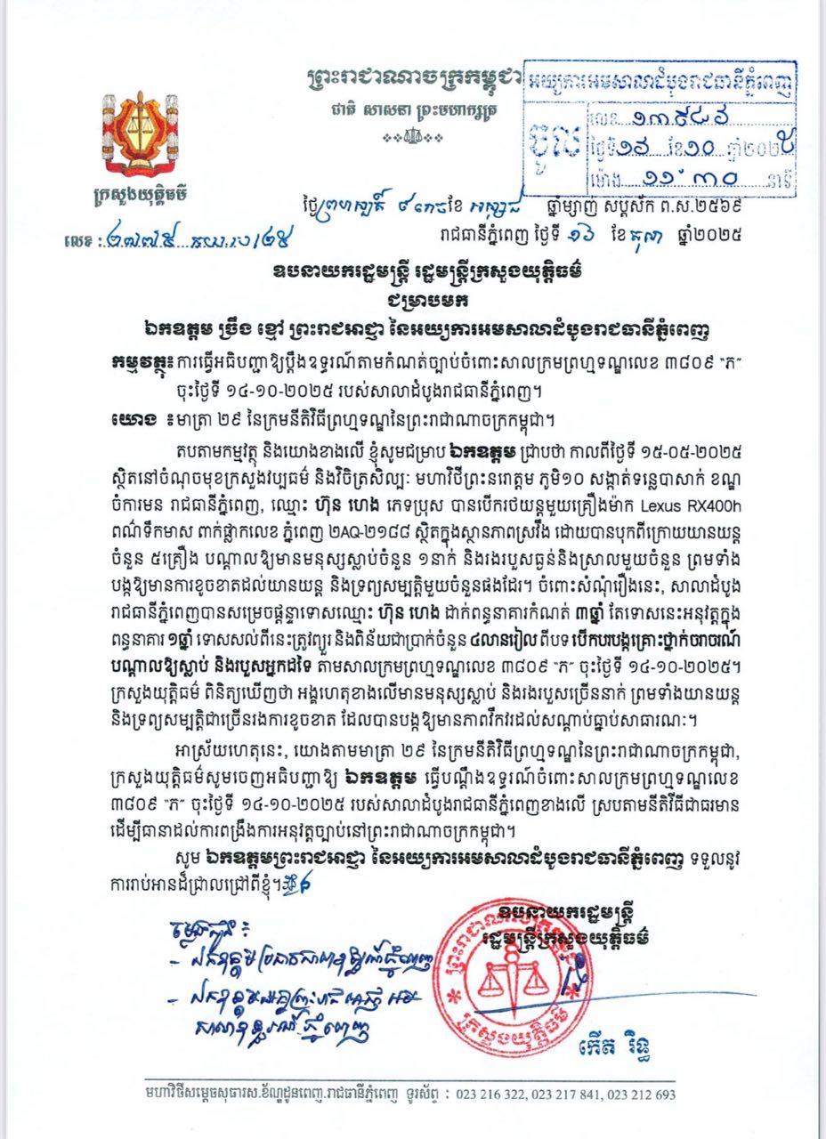 ភ្នំពេញ៖ ឧបនាយករដ្ឋមន្រ្តី កើត រិទ្ធ រដ្ឋមន្រ្តីក្រសួងយុត្តិធម៌ នៅថ្ងៃទី១៦ ខែតុលា ឆ្នាំ២០២៥ នេះ បានចេញអធិបញ្ជាឱ្យព្រះរាជអាជ្ញានៃអយ្យការអមសាលាដំបូងរាជធានីភ្នំពេញ ប្ដឹងឧទ្ធរណ៍ចំពោះសាលក្រមព្រហ្មទណ្ឌលេខ ៣៨០៩ “ក” ចុះថ្ងៃទី ១៤ ខែតុលា ឆ្នាំ២០២៥ របស់សាលាដំបូងរាជធានីភ្នំពេញ ករណីគ្រោះថ្នាក់ចរាចរណ៍បុកស្លាប់ និងរបួសច្រើននាក់ ដែលមានជនជាប់ចោទ ហ៊ុន ហេង អតីតមន្ត្រីនគរបាល នៃស្នងការដ្ឋាននគរបាលនគរបាលរាជធានីភ្នំពេញ។