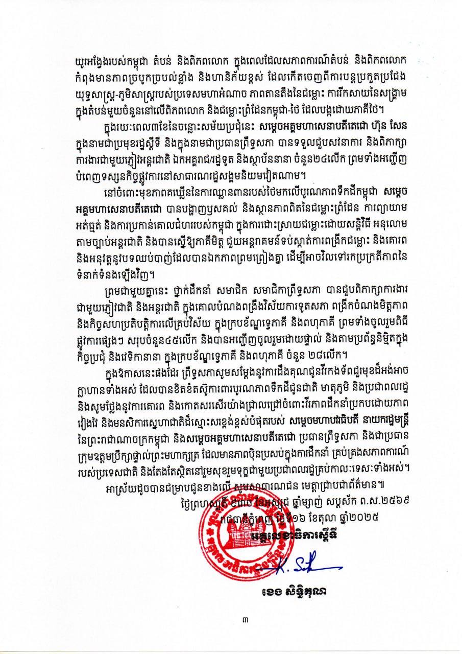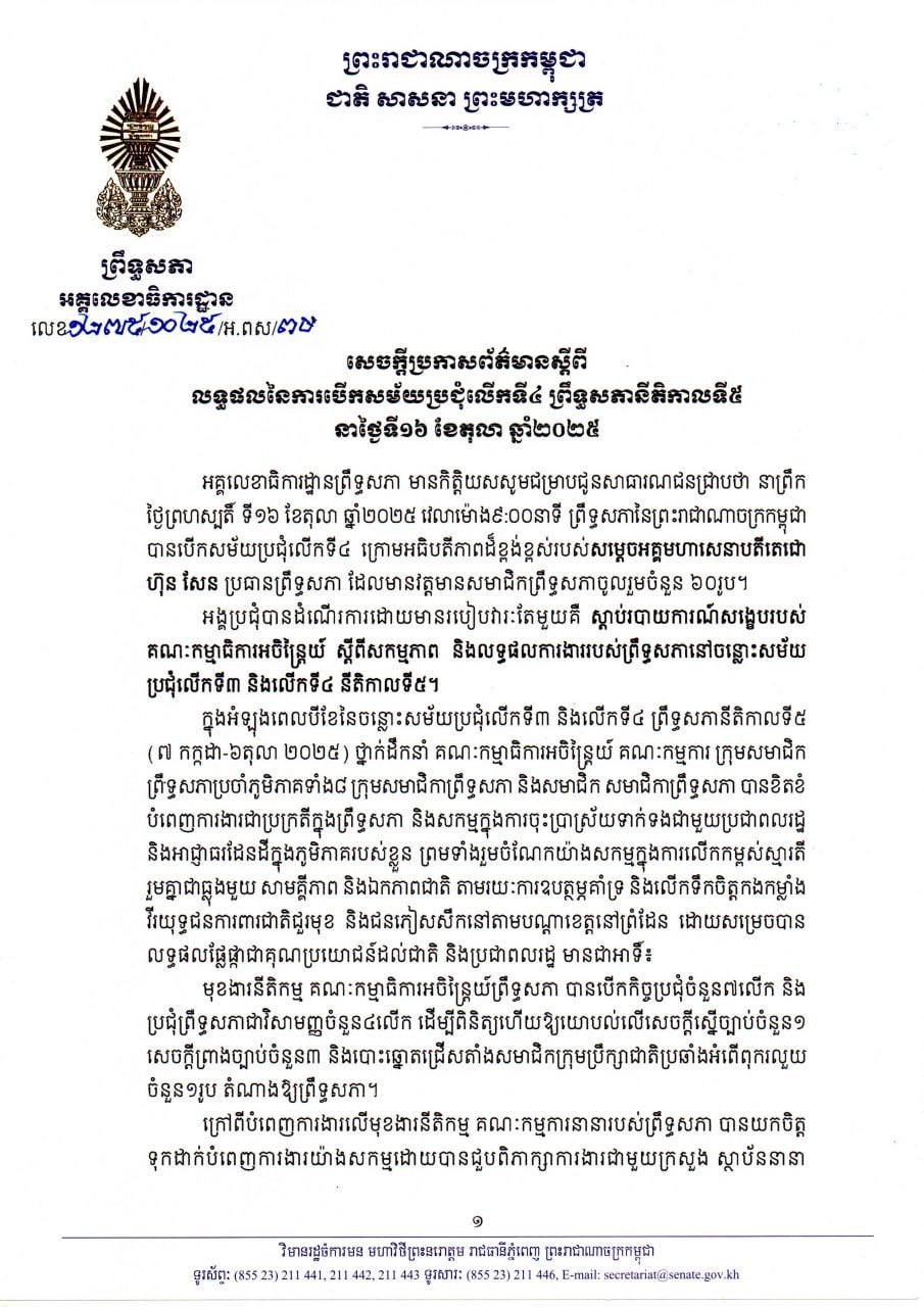 នេះបើយោងតាមខ្លឹមសារនៃសេចក្តីប្រកាសព័ត៍មាន ស្តីពី លទ្ធផលសម័យប្រជុំលើកទី៤ ព្រឹទ្ធសភា នីតិកាលទី៥ កាលពីថ្ងៃព្រហស្បតិ៍ ទី១៦ ខែតុលា ឆ្នាំ២០២៥នេះ។