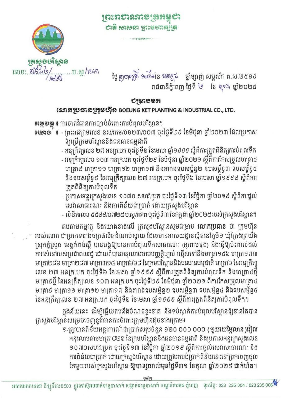 ដើម្បីឆ្លើយតបនឹងចំណុចខ្វះខាត និងទប់ស្កាត់ការបំពុលបរិស្ថានឱ្យខានតែបាន ក្រសួងបរិស្ថានសម្រេចចេញនូវវិធានការចំពោះក្រុមហ៊ុន BOEUNG KET PLANTING & INDUSTRIAL CO., LTD. គឺត្រូវបានពិន័យអន្តរការណ៍ជាប្រាក់ ចំនួន ១២០ លានរៀល អនុលោមតាមមាត្រា ៨២៦ នៃក្រមបរិស្ថាន និងធនធានធម្មជាតិ និងប្រកាសអន្តរក្រសួងលេខ ១០៧០សហវ.ប្រក ចុះថ្ងៃទី១៣ ខែវិច្ឆិកា ឆ្នាំ២០១៩ ស្តីពី ការផ្តល់សេវាសាធារណៈ និង ការពិន័យជាប្រាក់ ដោយក្រសួងបរិស្ថាន ដោយត្រូវមកបង់ប្រាក់ពិន័យនេះនៅច្រកចេញចូល តែមួយរបស់ក្រសួងបរិស្ថាន ឱ្យបានរួចរាល់មុនថ្ងៃទី៣១ ខែតុលា ឆ្នាំ២០២៥ ជាកំហិត។