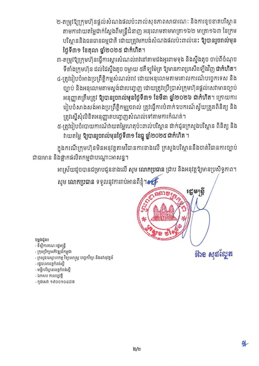 ក្រុមហ៊ុនខាងលើ ត្រូវរៀបចំអាងប្រព្រឹត្តិកម្មសំណល់រាវ ដោយអនុលោមតាមគោលការណ៍បច្ចេកទេស និងច្បាប់ និងអនុលោមតាមស្តង់ដារបញ្ចេញ ដោយត្រូវប្រើប្រាស់ក្រុមហ៊ុនផ្តល់សេវាមានច្បាប់ អនុញ្ញាតត្រឹមត្រូវ ឱ្យបានរួចរាល់មុនថ្ងៃទី៣១ ខែមីនា ឆ្នាំ២០២៦ ជាកំហិត។ ក្រោយការ រៀបចំសាងសង់អាងប្រព្រឹត្តិកម្មរួចរាល់ ត្រូវធ្វើការបំពាក់ឧបករណ៍ស្វ័យត្រួតពិនិត្យ និងត្រូវស្នើសុំលិខិតអនុញ្ញាតបញ្ចេញសំណល់ទៅតាមការកំណត់ និងត្រូវរៀបចំរបាយការណ៍វាយតម្លៃហេតុប៉ះពាល់បរិស្ថាន ដាក់ជូនក្រសួងបរិស្ថាន ពិនិត្យ និងវាយតម្លៃ ឱ្យបានរួចរាល់មុនថ្ងៃទី៣១ ខែធ្នូ ឆ្នាំ២០២៥ ជាកំហិត។