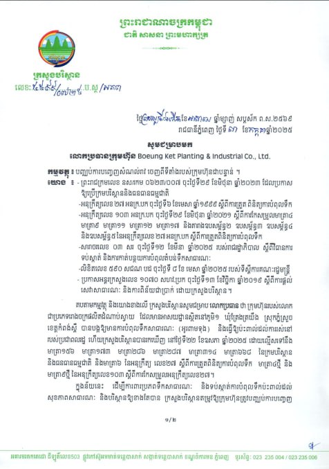 កំពង់ស្ពឺ៖ ក្រុមហ៊ុន BOEUNG KET PLANTING & INDUSTRIAL CO., LTD. ដែលជាប្រភេទរោងចក្រផលិតដំណាប់ស្វាយ ដែលមានអាសយដ្ឋានស្ថិតនៅភូមិ១ ឃុំត្រែងត្រយឹង ស្រុកភ្នំស្រួច ខេត្តកំពង់ស្ពឺ បានបង្កឱ្យមានការបំពុលទឹកសាធារណៈ «អូរពាមទុង» និងធ្វើឱ្យប៉ះពាល់ដល់ការរស់នៅរបស់ប្រជាពលរដ្ឋ ដោយពុំបានអនុលោមតាមបញ្ញត្តិច្បាប់ ត្រូវបានក្រសួងបរិស្ថាន ផាកពិន័យអន្តរការណ៍ជាប្រាក់ សរុបចំនួន ១២០ លានរៀល និងចាត់វិធានការច្បាប់មួយចំនួនទៀត។