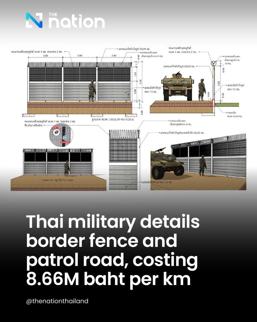 ថៃ៖ កងទ័ពភូមិន្ទថៃ បានបង្ហាញព័ត៌មានលម្អិតអំពីប្លង់នៃការសាងសង់របងព្រំដែនកម្ពុជា-ថៃ ថ្មី ដែលមានបន្ទះបេតុង ខ្សែលួស និងផ្លូវល្បាត មានតម្លៃសរុបប្រមាណ ៨,៦៦លានបាតក្នុង ១គីឡូម៉ែត្រ។ នេះបើតាមការចេញផ្សាយពីកាសែតថៃ The Nation នៅថ្ងៃទី១៧ តុលា ឆ្នាំ២០២៥។