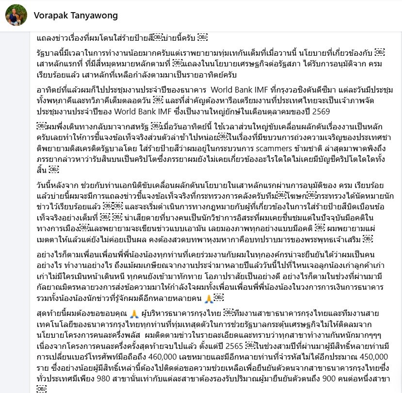 លោក Vorapak បានបញ្ជាក់ថា របាយនោះមិនពិតទាំងស្រុងទេ ហើយខ្លួនមិនដែលពាក់ព័ន្ធជាមួយសកម្មភាពបោកប្រាស់ ឬមានគណនីហិរញ្ញវត្ថុណាមួយដែលពាក់ព័ន្ធនឹងក្រុមនោះឡើយ។ លោកបន្ថែមថា ពេលនេះរដ្ឋាភិបាលកំពុងប្រឈមនឹងបញ្ហាសេដ្ឋកិច្ច និងសន្តិសុខហិរញ្ញវត្ថុជាច្រើន ដែលតម្រូវឲ្យមានការងារយ៉ាងតឹងរឹង និងការសហការយ៉ាងជិតស្និទ្ធជាមួយស្ថាប័នអន្តរជាតិ។