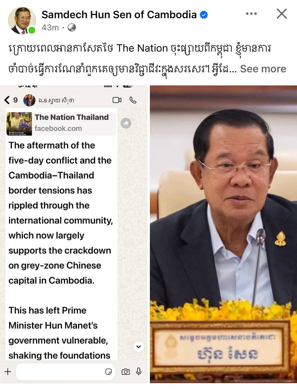 សម្ដេច តេជោ ហ៊ុន សែន បានបង្ហោះសារនៅថ្ងៃទី២៣ តុលា នេះថា៖ ក្រោយពេលអានកាសែតថៃ The Nation ចុះផ្សាយពីកម្ពុជា ខ្ញុំមានការចាំបាច់ធ្វើការណែនាំពួកគេឲ្យមានវិជ្ជាជីវៈក្នុងសរសេរ។ អ្វីដែលខ្ញុំគួរណែនាំទៅក្រុមកាសែតអស់លោកនោះគឺថា អស់លោកគួរផ្តោតការយកចិត្តទុកដាក់លើសភាពការណ៍ផ្ទៃក្នុងថៃល្អជាង មកគិតពីអនាគតនយោបាយផ្ទៃក្នុងកម្ពុជា។