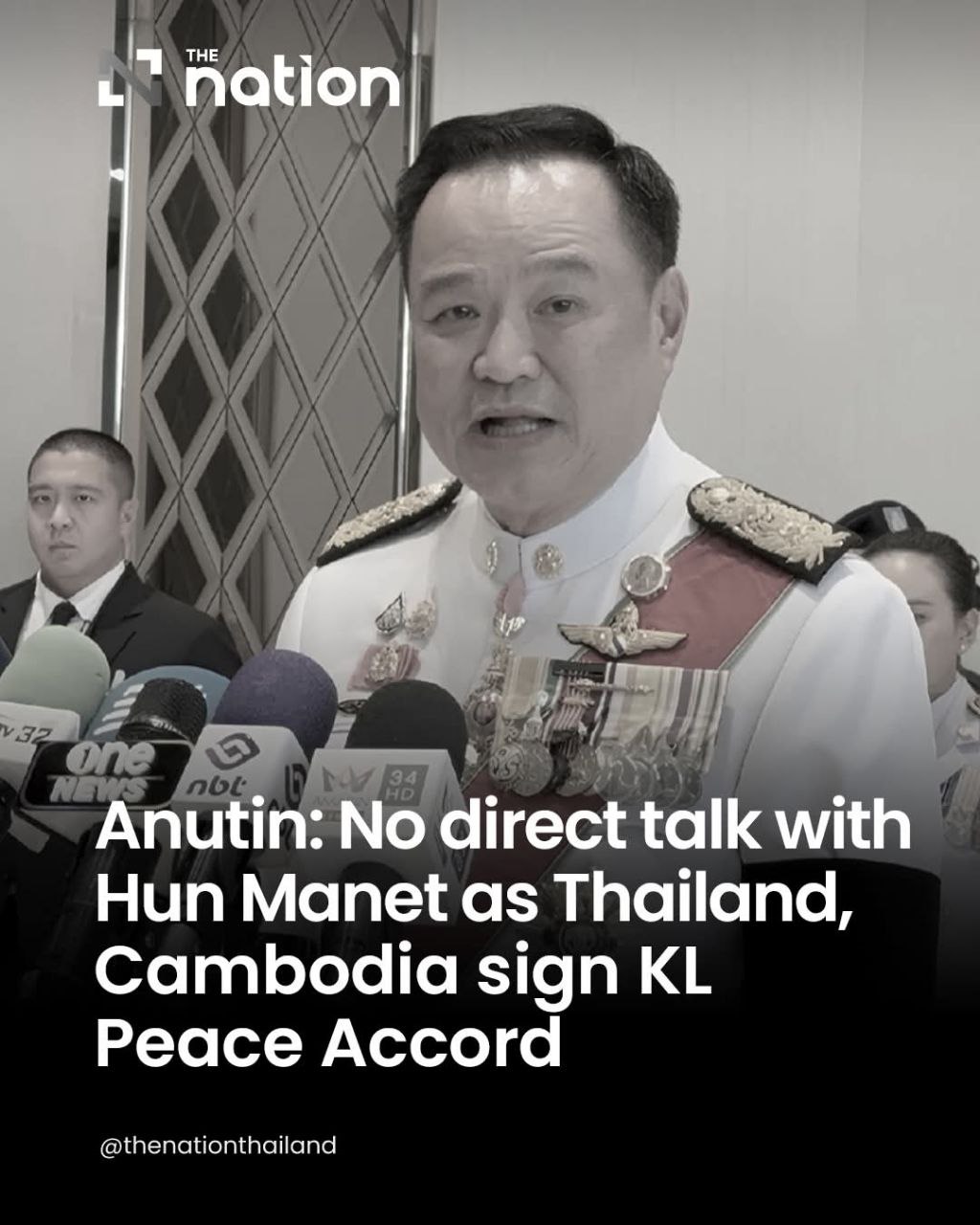 ថៃ៖ លោក Anutin Charnvirakul បាននិយាយថា លោកមិនបានជួបពិភាក្សាមួយទល់មួយជាមួយសមភាគីកម្ពុជា គឺសម្ដេច ហ៊ុន ម៉ាណែត នោះទេ ក្នុងអំឡុងពេលដំណើរទស្សនកិច្ចរបស់លោកទៅកាន់ទីក្រុង Kuala Lumpur សម្រាប់ការចុះហត្ថលេខាលើសេចក្តីប្រកាសរួមស្តីពីការកសាងសន្តិភាពឡើងវិញនោះទេ។