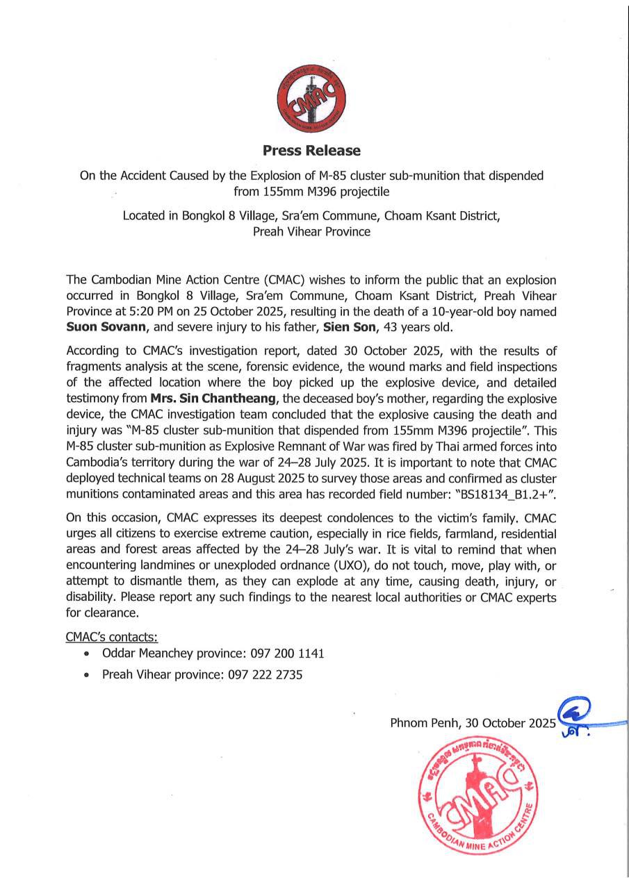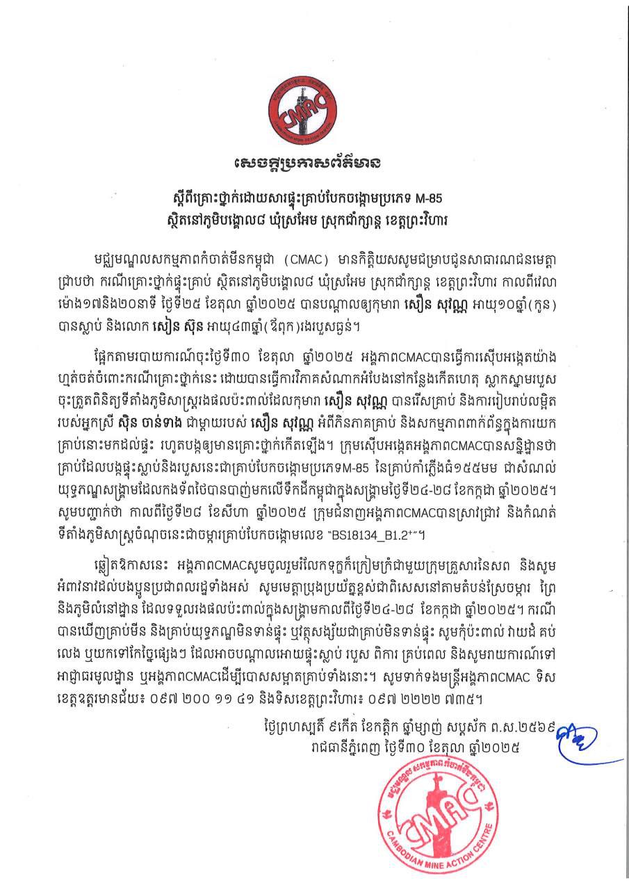 ភ្នំពេញ៖ ករណី គ្រោះថ្នាក់ផ្ទុះគ្រាប់ ស្ថិតនៅភូមិបង្គោល៨ ឃុំស្រអែម ស្រុកជាំក្សាន្ត ខេត្តព្រះវិហារ កាលពីវេលាម៉ោង ១៧និង២០នាទី ថ្ងៃទី២៥ ខែតុលា ឆ្នាំ២០២៥ កន្លងមក បានបណ្តាលឲ្យកុមារា សឿន សុវណ្ណ អាយុ ១០ឆ្នាំបានស្លាប់ និងលោក សៀន ស៊ុន អាយុ ៤៣ឆ្នាំ ត្រូវជាឪពុករងរបួសធ្ងន់។ ផ្អែកតាមរបាយការណ៍ចុះថ្ងៃទី៣០ ខែតុលា ឆ្នាំ២០២៥នេះ របស់អង្គភាព CMAC បានសន្និដ្ឋានថា “គ្រាប់ដែលបង្កផ្ទុះស្លាប់ និងរបួសនេះជាគ្រាប់បែកចង្កោម ប្រភេទ M-85 នៃគ្រាប់កាំភ្លើងធំ ១៥៥ មម ជាសំណល់យុទ្ធភណ្ឌសង្រ្គាមដែលកងទ័ពថៃ បានបាញ់មកលើទឹកដីកម្ពុជាក្នុងសង្គ្រាមថ្ងៃទី២៤-២៨ ខែកក្កដា ឆ្នាំ២០២៥”។