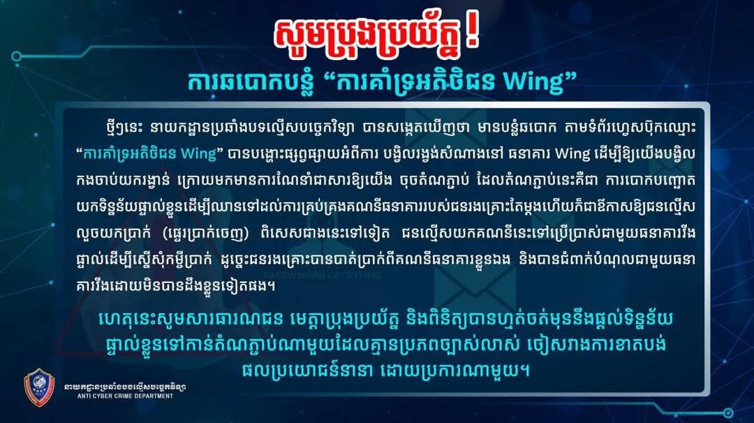 នាយកដ្ឋានប្រឆាំងបទល្មើសបច្ចេកវិទ្យា បានសង្កេតឃើញថា ថ្មីៗនេះ មានករណី ឆបោក តាមទំព័រហ្វេសប៊ុកឈ្មោះ “ការគាំទ្រអតិថិជន” បានបង្ហោះផ្សព្វផ្សាយអំពីការ បង្វិលរង្វង់សំណាងនៅធនាគារ Wing ដើម្បីឱ្យយើងបង្វិលកងចាប់យករង្វាន់ ក្រោយមកមានការណែនាំជាសារឱ្យយើងចុចតំណភ្ជាប់ ដែលតំណភ្ជាប់នេះ គឺជា ការបោកបញ្ឆោតយកទិន្នន័យផ្ទាល់ខ្លួន ដើម្បីឈានទៅដល់ការគ្រប់គ្រងគណនីធនាគាររបស់ជនរងគ្រោះតែម្តង។
