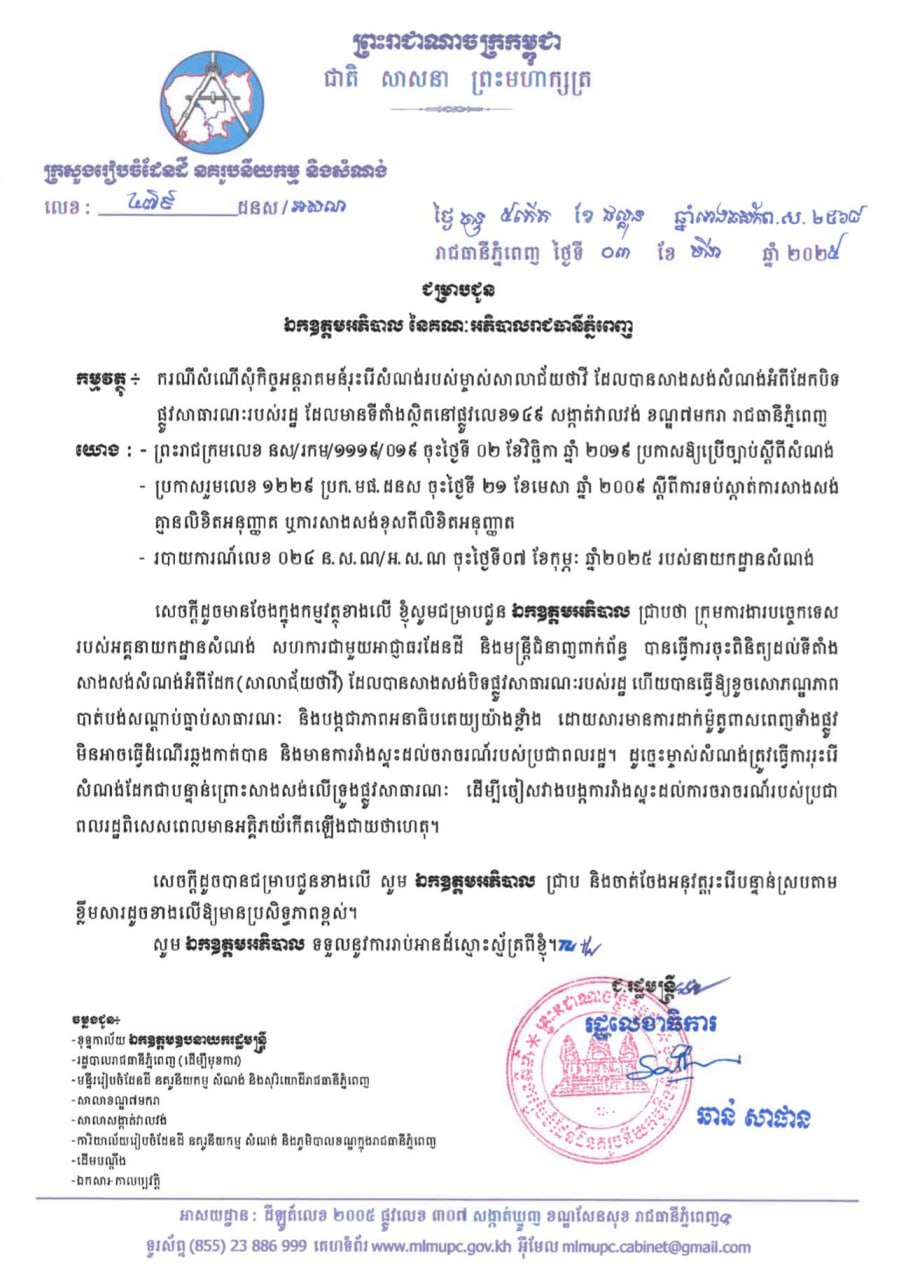 ភ្នំពេញ៖ នៅថ្ងៃទី០៤ ខែវិច្ឆិកា ឆ្នាំ២០២៥ ក្រសួងរៀបចំដែនដី នគរូបនីយកម្ម និងសំណង់ បានពិនិត្យឃើញថា បណ្តាញផ្សព្វផ្សាយសង្គមមួយ បានបង្ហោះព័ត៌មានដែលមានខ្លឹមសារថា «ម្ចាស់សំណង់សាលាជ័យថាវី បានដាក់លិខិតស្នើសុំមកក្រសួង ដើម្បីស្នើសុំចាត់មន្ត្រីចុះពិនិត្យការរុះរើសំណង់របស់ខ្លួន ព្រោះនេះអាចជាការបម្រើឱ្យផលប្រយោជន៍បុគ្គលឯកជនណាមួយ»។