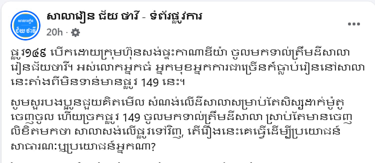 ពាក់ចំណាត់ការរបស់ក្រសួងនេះ សាលាជ័យថាវី បានបញ្ជាក់លើបណ្តាញសង្គមផ្លូវការរបស់ខ្លួនថា៖ «ផ្លូវ១៤៩ បើកដោយក្រុមហ៊ុនសង់ផ្ទះកាណាឌីយ៉ា ចូលមកទាល់ត្រឹមដីសាលារៀនជ័យថាវី។ អស់លោកអ្នកធំ អ្នកមុខអ្នកការជាច្រើនក៏ធ្លាប់រៀននៅសាលានេះតាំងពីមិនទាន់មានផ្លូវ ១៤៩ នេះ»។ សូមសួរបងប្អូនជួយគិតមើល សំណង់លើដីសាលាសម្រាប់តែសិស្សដាក់ម៉ូតូចេញ-ចូល ហើយច្រកផ្លូវ ១៤៩ ចូលមកទាល់ត្រឹមដីសាលា ស្រាប់តែមានចេញលិខិតមកថា “សាលាសង់លើផ្លូវទៅវិញ” តើរឿងនេះគេធ្វើដើម្បីប្រយោជន៍សាធារណៈ ឬប្រយោជន៍អ្នកណា?៕