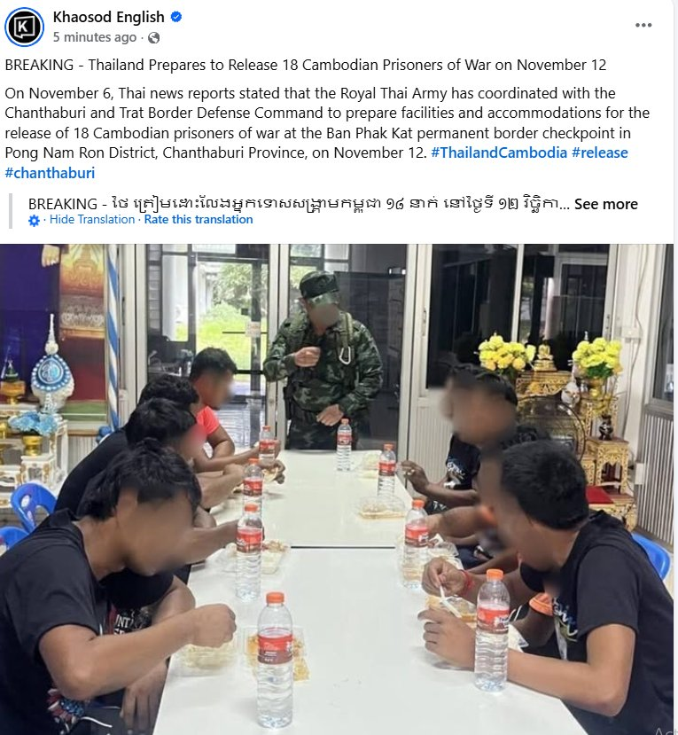 ថៃ៖ បើវាជាការពិតដូចដែលការចុះផ្សាយរបស់ការសែតថៃមែននោះ ថាយោធាថៃត្រៀមក្នុងធ្វើការដោះលែងវីរៈកងទ័ពកម្ពុជាទាំង១៨រូប នៅថ្ងៃទី១២ ខែវិច្ឆិកា ២០២៥ ខាងមុខនេះ ពិតដំណឹងដ៏សែនរីករាយបំផុស របស់កម្ពុជា ។