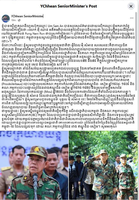 ប៉ុន្តែ ប៉ុន្មានមួយម៉ោងក្រោយមក ឯ.ឧ អ៊ី ឈាន បានចេញសារបញ្ជាក់ជូនបងប្អូនជនរួមជាតិថា÷ អ្វីដែល អ៊ុំ សំអាន សរសេរនេះគឺជាការប្រឌិតទាំងស្រុង និងមានចរិតញុះញង់ដើម្បីបង្ករឿង និងកេងចំណេញនយោបាយក្នុងចេតនាបង្កចលាចលសង្គម និងការយល់ច្រឡំមកលើកិច្ចការព្រំដែន ដែលរាជរដ្ឋាភិបាល និងគណៈកម្មការចម្រុះខណ្ឌសីមាព្រំដែនគោក(JBC) កម្ពុជាកំពុងអនុវត្តដោយឈរលើមូលដ្ឋានច្បាប់អន្ដរជាតិ អនុសញ្ញា សទ្ធិសញ្ញា ផែនទីនិងឯកសារដែលបន្សល់ទុកពីបារាំង។