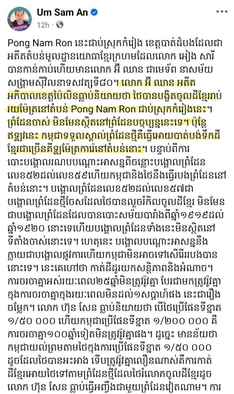 កាលពីព្រឹកមិញនេះ លោក អ៊ុំ សំអាន បានបង្ហោះសារនៅក្នុងគណនីហ្វេសប៊ុករបស់ខ្លួនថា÷ Pong Nam Ron នេះជាប់ស្រុកកំរៀង ខេត្តបាត់ដំបង ដែលជាអតីតតំបន់មូលដ្ឋានយោធាខ្មែរក្រហមដែលលោក អៀង សារី បានកាន់កាប់ហើយមានលោក អ៊ី ឈាន ជាមេទ័ព នាសម័យសង្រ្គាមស៊ីវិលនាទសវត្សទី៨០។ លោក អ៊ី ឈាន អតីតអភិបាលខេត្តប៉ៃលិនធ្លាប់និយាយថា ថៃបានបង្ខិតចូលដីខ្មែររាប់រយម៉ែត្រនៅតំបន់ Pong Nam Ron ជាប់ស្រុកកំរៀងនេះ។ ព្រំដែនចាស់ មិនមែនស្ថិតនៅព្រំដែនបច្ចុប្បន្ននេះទេ។ ប៉ុន្តែឥឡូវនេះ កម្ពុជាទទួលស្គាល់ព្រំដែនថ្មីគឺធ្វើឱ្យបាត់បង់ទឹកដីខ្មែរជាច្រើនគីឡូម៉ែត្រការ៉េនៅតំបន់នោះ។
