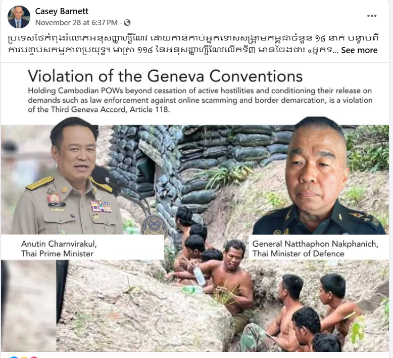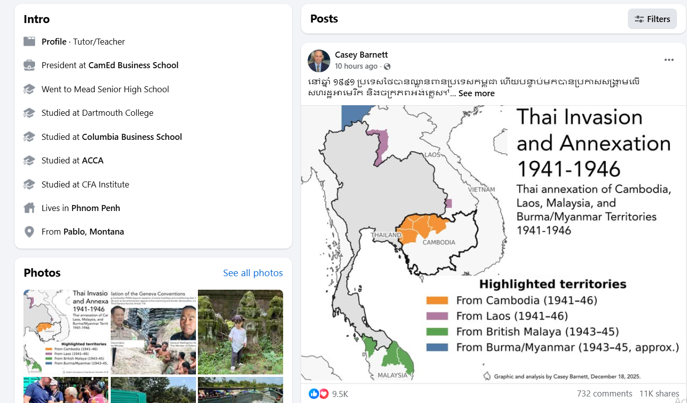 ប្រធានសភាពាណិជ្ជកម្មអាមេរិកប្រចាំកម្ពុជា លោក Casey Barnett បានបង្ហោះសំណេរបញ្ជាក់ច្បាស់ៗថា កម្ពុជាពិតជារងគ្រោះពិតប្រាកដ នៃអំពើឈ្លានពានទឹកដីពីសំណាក់ថៃ មិនមែនតែម្ដងនេះឡើយ ក្នុងខ្លឹមសារដែលលោកបង្ហោះសរសេរថា៖ នៅឆ្នាំ១៩៤១ ប្រទេសថៃបានឈ្លានពានប្រទេសកម្ពុជា ហើយបន្ទាប់មកបានប្រកាសសង្គ្រាមលើសហរដ្ឋអាមេរិក និងចក្រភពអង់គ្លេស។