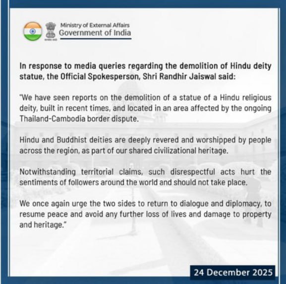 ក្រសួងការបរទេសឥណ្ឌា កាលពីថ្ងៃពុធ ទី២៤ ខែធ្នូ បានចេញសេចក្តីថ្លែងការណ៍ថ្កោលទោសថៃយ៉ាងតឹងរ៉ឹងចំពោះការកម្ទេចរូបសំណាកព្រះព្រហ្មញ្ញសាសនា ដែលទើបកសាងឡើងថ្មីៗ នៅតំបន់ព្រំដែនរងជម្លោះរវាងកម្ពុជា និងថៃ។