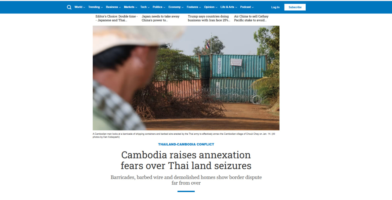 ភ្នំពេញ៖ កាសែតអន្តរជាតិល្បីឈ្មោះរបស់ជប៉ុន «Nikkei Asia» នៅថ្ងៃទី២០ ខែមករា ឆ្នាំ២០២៦ បានចេញផ្សាយអត្ថបទមួយ ដោយដាក់ចំណងជើងធំៗថា «កម្ពុជាបង្ហាញពីក្តីកង្វល់នៃការលេបយកទឹកដី ជុំវិញការរឹបអូសយកដីពីសំណាក់ភាគីថៃ»ដែលបានទាក់ទាញការចាប់អារម្មណ៍យ៉ាងខ្លាំងពីសាធារណជន និងអ្នកតាមដានបញ្ហាព្រំដែនក្នុងតំបន់។
