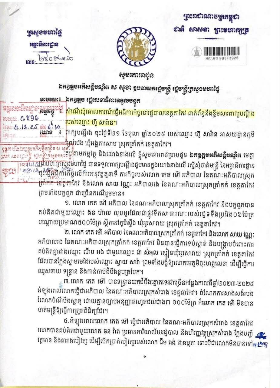 យោងតាមពាក្យបណ្តឹងចុះថ្ងៃទី ២១ ខែតុលា ឆ្នាំ ២០២៥ បានចោទប្រកាន់លោក កេត ម៉ៅ អភិបាលស្រុកត្រាំកក់ និងលោក សាយ វណ្ណៈ អភិបាលរងស្រុក ព្រមទាំងបក្ខពួកថា បានប្រព្រឹត្តអំពើមិនប្រក្រតីជាច្រើនករណីក្នុងការអនុវត្តតួនាទីរដ្ឋបាល។