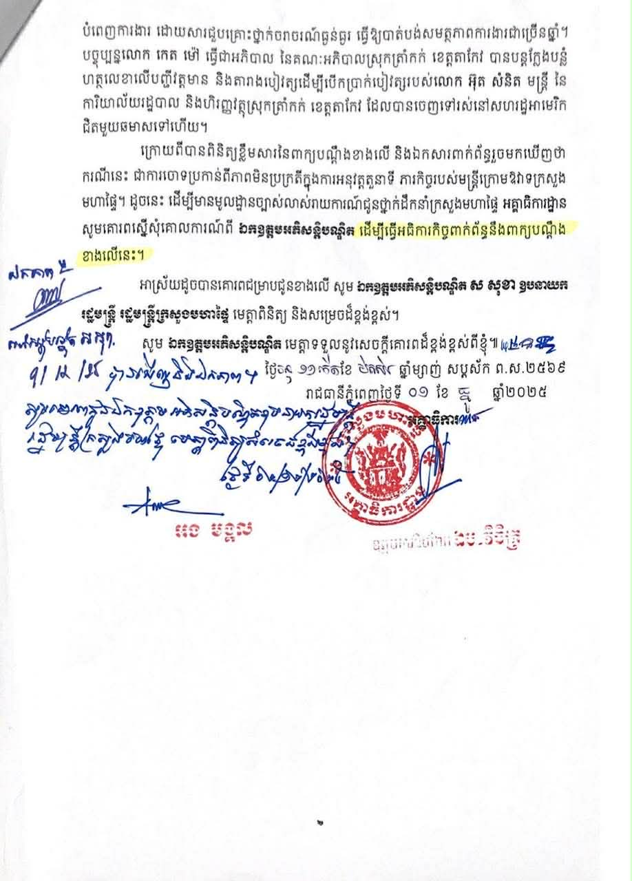 ក្រោយពីបានពិនិត្យខ្លឹមសារនៃពាក្យបណ្តឹងខាងលើ និងឯកសារពាក់ព័ន្ធរួចមកឃើញថា ករណីនេះ ជាការចោទប្រកាន់ពីភាពមិនប្រក្រតីក្នុងការអនុវត្តតួនាទី ភារកិច្ចរបស់មន្ត្រីក្រោមឱវាទក្រសួងមហាផ្ទៃ។ ដូចនេះ ដើម្បីមានមូលដ្ឋានច្បាស់លាស់រាយការណ៍ជូនថ្នាក់ដឹកនាំក្រសួងមហាផ្ទៃ អគ្គាធិការដ្ឋាន បានស្នើសុំគោលការណ៍ពី លោកឧបនាយករដ្ឋមន្ត្រី ស សុខា រដ្ឋមន្ត្រីក្រសួងមហាផ្ទៃ ដើម្បីធ្វើអធិការកិច្ចពាក់ព័ន្ធនឹងពាក្យបណ្តឹខាងលើនេះ នៅថ្ងៃទី០១ ខែធ្នូ ឆ្នាំ២០២៥ ហើយលោកឧបនាយករដ្ឋបានចារឯកភាពទៅសំណើរនេះ៕