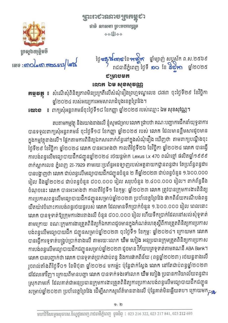 យោងតាមលិខិតឆ្លើយតបចំពោះពាក្យសុំអន្តរាគមន៍ចុះថ្ងៃទី១៨ ខែកញ្ញា ឆ្នាំ២០២៥ របស់លោក ឯម សុខសុវណ្ណ គណៈបញ្ជាការដឹកនាំយុទ្ធនាការ បានពិនិត្យឯកសារពាក់ព័ន្ធឃើញថា «បញ្ហាបានកើតឡើងពីការបង់ពន្ធលើមធ្យោបាយដឹកជញ្ជូនរថយន្ត Lexus LX470 ឆ្នាំ២០២៣ និងឆ្នាំ២០២៤ ដែលប្រព័ន្ធពន្ធដារបង្ហាញថា នៅតែមានបំណុលពន្ធ សរុបចំនួន ២.៤ លានរៀល»។
