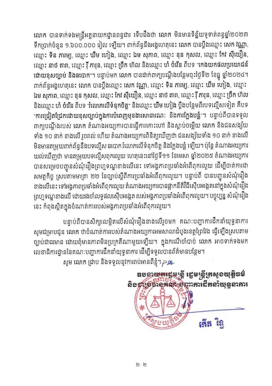 ក្រោយការស៊ើបអង្កេត តំណាងអយ្យការបានសន្និដ្ឋានថា មិនមានតម្រុយបទល្មើសឆបោក ឬក្លែងបន្លំឡើយ ប៉ុន្តែ រកឃើញតម្រុយពាក់ព័ន្ធអំពើពុករលួយ ដូច្នេះនៅថ្ងៃទី១១ ខែមេសា ឆ្នាំ២០២៥ សំណុំរឿងត្រូវបានបញ្ជូនទៅអង្គភាពប្រឆាំងអំពើពុករលួយ ដើម្បីបន្តចាត់ការតាមសមត្ថកិច្ច។