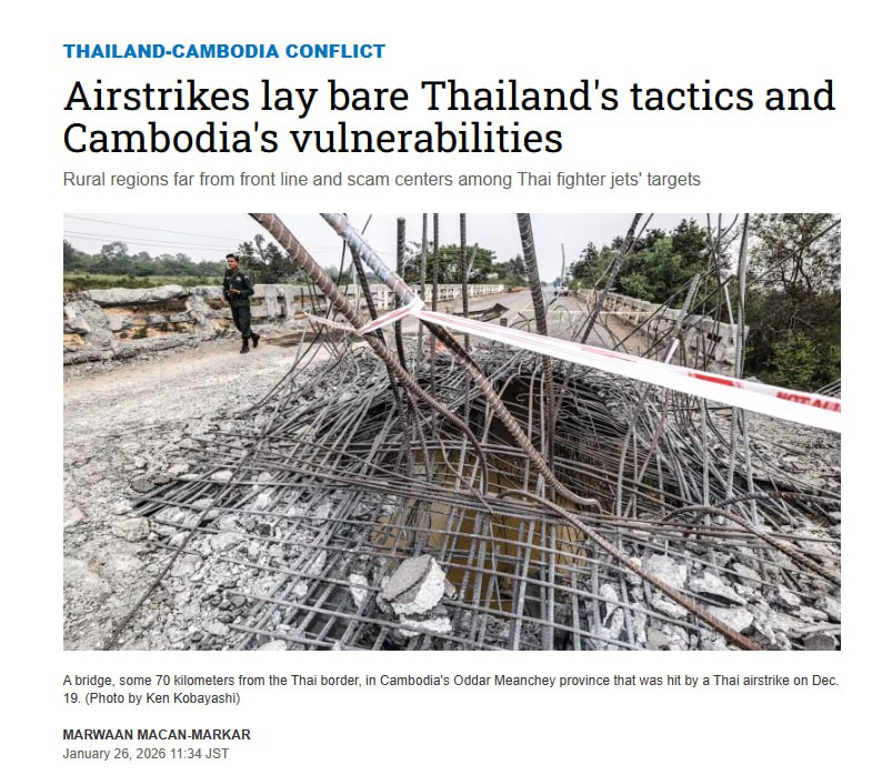 ភ្នំពេញ៖ កាសែតអន្តរជាតិ Nikkei Asia បានចេញផ្សាយអត្ថបទមួយក្រោមចំណងជើង “Airstrikes lay bare Thailand's tactics and Cambodia's vulnerabilities” ដោយលើកឡើងអំពីការប្រើប្រាស់ការវាយប្រហារតាមអាកាសរបស់ភាគីថៃ និងការបង្ហាញច្បាស់ពីចំណុចខ្សោយផ្នែកការពារជាតិ និងសន្តិសុខរបស់កម្ពុជា ក្នុងស្ថានការណ៍តានតឹងតាមបណ្តោយព្រំដែនរវាងប្រទេសទាំងពីរ។