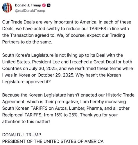 លោក ត្រាំ បានបញ្ជាក់ថា ដោយសារតែនីតិបញ្ញត្តិកូរ៉េខាងត្បូង មិនបានអនុម័តកិច្ចព្រមព្រៀងពាណិជ្ជកម្មជាមួយទីក្រុងវ៉ាស៊ីនតោនបានត្រឹមត្រូវ ដូច្នេះលោកសម្រេចបង្កើនពន្ធរបស់កូរ៉េខាងត្បូងលើរថយន្ត ឈើ ឱសថ និងពន្ធគយផ្សេងទៀតទាំងអស់ពី 15% ទៅ 25% វិញ។