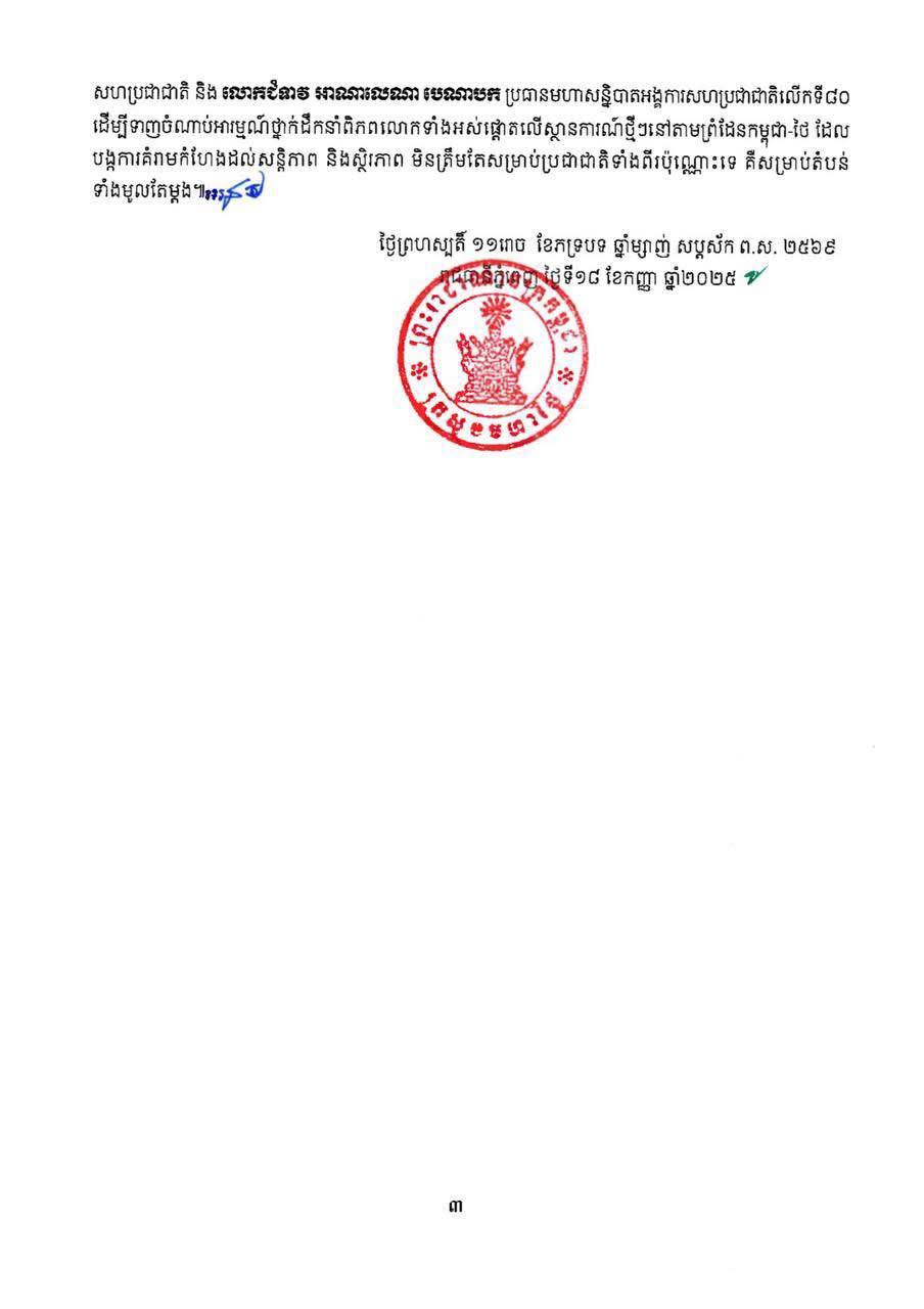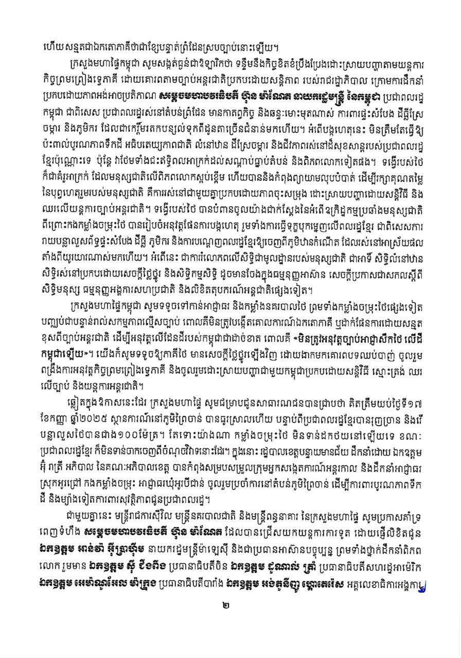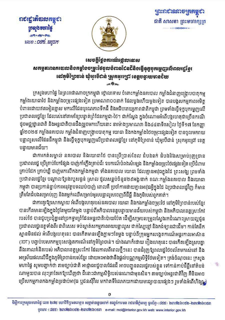 ក្រសួងមហាផ្ទៃកម្ពុជា សូមសង្កត់ធ្ងន់ជាឱឡារិកថា ទន្ទឹមនឹងកិច្ចខិតខំប្រឹងប្រែងដោះស្រាយបញ្ហាតាមយន្តការ កិច្ចព្រមព្រៀងទ្វេភាគី ដោយគោរពតាមច្បាប់អន្តរជាតិ ប្រកបដោយសន្តិភាព របស់រាជរដ្ឋាភិបាល ក្រោមការដឹកនាំប្រកបដោយភាពអង់អាចប្រតិភាណ សម្តេចធិបតី ហ៊ុន ម៉ាណែត នាយករដ្ឋមន្ត្រីនៃកម្ពុជា ប្រជាពលរដ្ឋកម្ពុជា ជាពិសេស ប្រជាពលរដ្ឋរស់នៅតំបន់ព្រំដែន មានកាតព្វកិច្ច និងឆន្ទៈមោះមុតណាស់ ការពារផ្ទះសំបែង ដីធ្លីស្រែ ចម្ការ និងភូមិករ ដែលជាកេរ្តិ៍មរតកបន្សល់ទុកពីដូនតាច្រើនជំនាន់មកហើយ។ អំពើបង្កហេតុនេះ មិនត្រឹមតែធ្វើឱ្យប៉ះពាល់បូរណភាពទឹកដី អធិបតេយ្យភាពជាតិ លំនៅឋាន ដីស្រែចម្ការ និងជីវភាពរស់នៅដ៏សុខសាន្តរបស់ប្រជាពលរដ្ឋខ្មែរប៉ុណ្ណោះទេ ប៉ុន្តែវាថែមទាំងជះឥទ្ធិពលអាក្រក់ដល់សណ្តាប់ធ្នាប់តំបន់ និងពិភពលោកទៀតផង។
