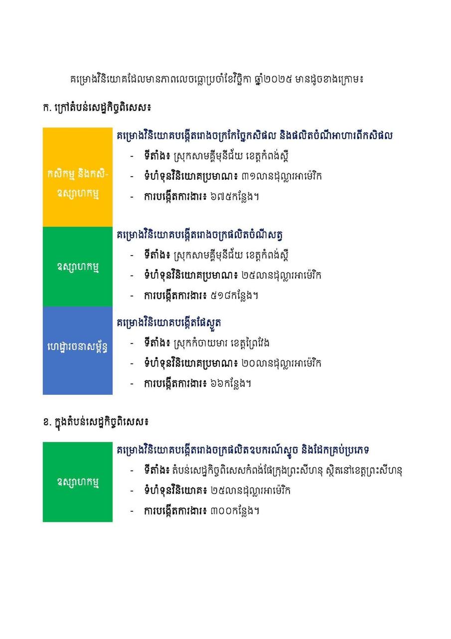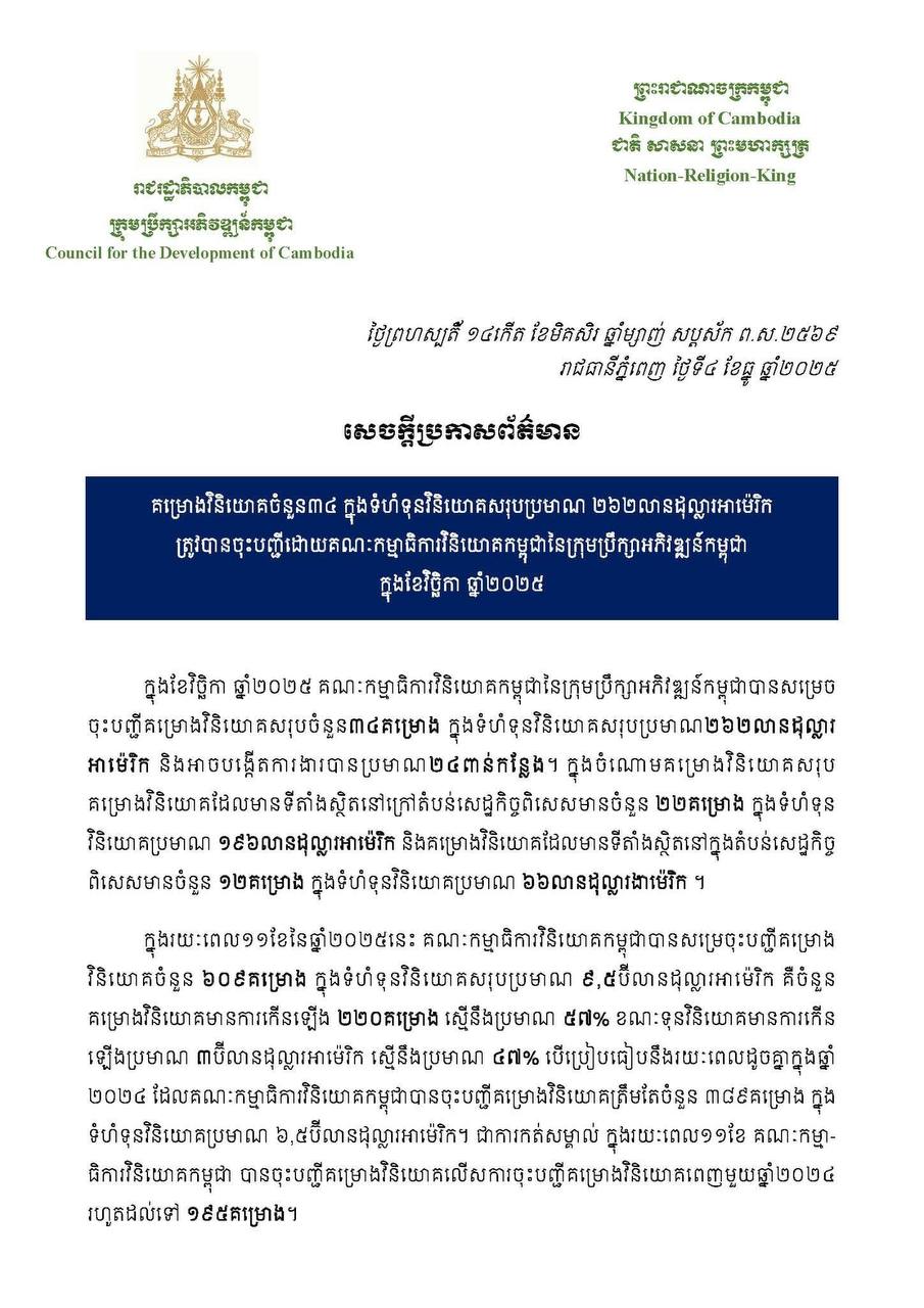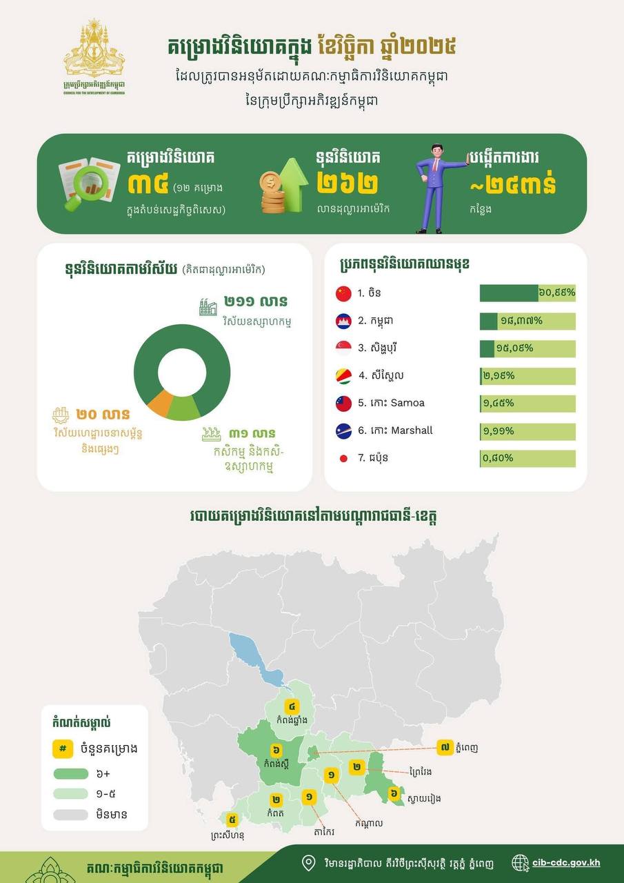 ភ្នំពេញ៖ ក្នុងខែវិច្ឆិកា ឆ្នាំ២០២៥ គណៈកម្មាធិការវិនិយោគកម្ពុជា នៃក្រុមប្រឹក្សាអភិវឌ្ឍន៍កម្ពុជាបានសម្រេច ចុះបញ្ជីគម្រោងវិនិយោគសរុបចំនួន ៣៤ គម្រោង ក្នុងទំហំទុនវិនិយោគសរុបប្រមាណ ២៦២ លានដុល្លារអាម៉េរិក និងអាចបង្កើតការងារបានប្រមាណ ២៤ ពាន់កន្លែង។