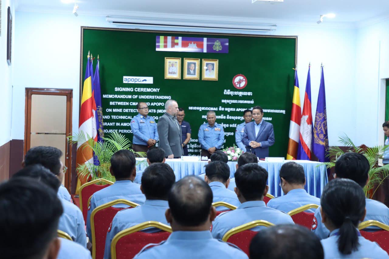 ភ្នំពេញ៖ នៅព្រឹកថ្ងៃព្រហស្បតិ៍ ទី០៤ ខែធ្នូ ឆ្នាំ២០២៥ នៅទីបញ្ជាការដ្ឋានអង្គភាព CMAC រាជធានីភ្នំពេញ អគ្គនាយក CMAC លោក ហេង រតនា និងលោក Michael Raine ប្រធានអង្គការ APOPO ប្រចាំកម្ពុជា បានចុះហត្ថលេខាលើអនុស្សរណៈយោគយល់ (MoU) ស្តីពី ការអនុវត្តគម្រោងសមាហរណកម្មកណ្តុរហិតមីន និងសុនខស្រាវជ្រាវបច្ចេកទេសថ្មីមួយ។