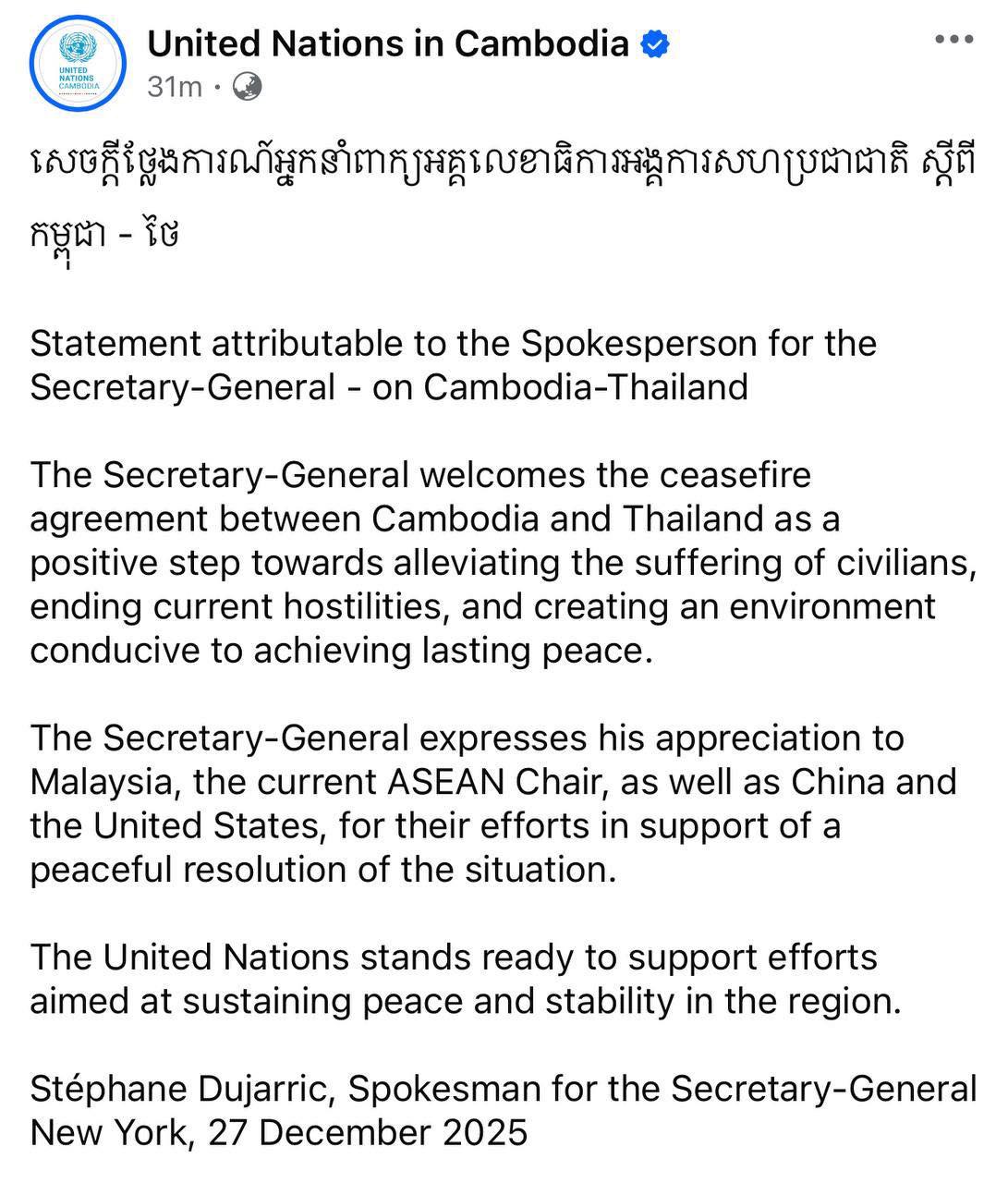 លោក Stéphane Dujarric អ្នកនាំពាក្យរបស់អគ្គលេខាធិការអង្គការសហប្រជាជាតិ បានចេញសេចក្តីថ្លែងការណ៍ចេញពីទីក្រងញូវយ៉ក សហរដ្ឋអាមេរិក កាលពីថ្ងៃទី២៧ ខែធ្នូ ឆ្នាំ២០២៥ ក្រោយការប្រកាសបទឈប់បាញ់កម្ពុជា-ថៃ ក្នុងកិច្ចប្រជុំពិសេសលើកទី៣ នៃគណៈកម្មាធិការព្រំដែនទូទៅ (GBC) នៅច្រកព្រំដែនអន្តរជាតិព្រំ ខេត្តប៉ៃលិន ប្រទេសកម្ពុជា-បានផាកកាតខេត្តចន្ទបុរី ប្រទេសថៃ។
