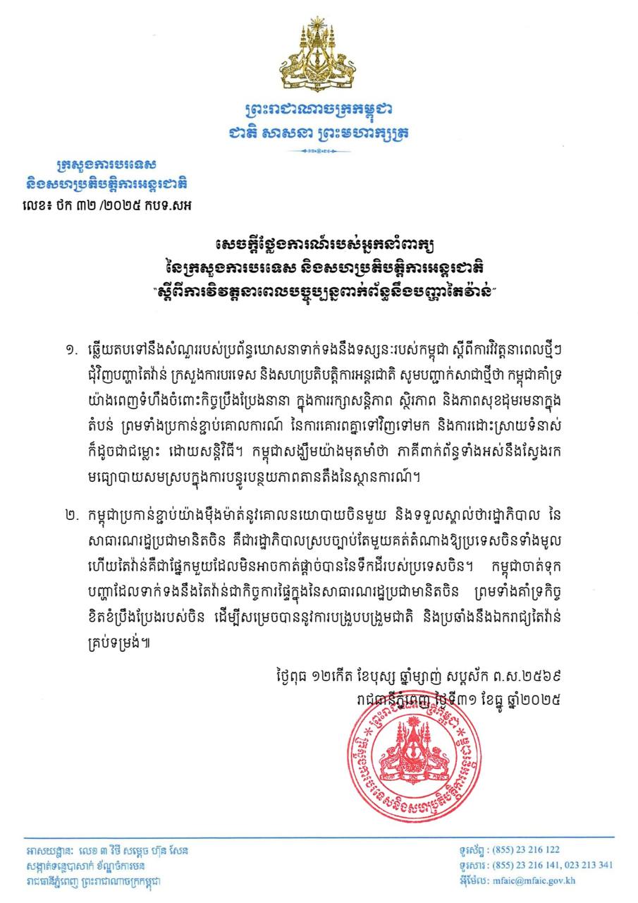 ភ្នំពេញ៖ ក្រសួងការបរទេស និងសហប្រតិបត្តិការអន្តរជាតិ បានចេញសេចក្តីថ្លែងការណ៍ បញ្ជាក់ជំហររបស់កម្ពុជា ជុំវិញការវិវត្តនាពេលបច្ចុប្បន្នពាក់ព័ន្ធនឹងបញ្ហាតៃវ៉ាន់ ដោយអះអាងថា «កម្ពុជាគាំទ្រយ៉ាងពេញទំហឹងចំពោះកិច្ចប្រឹងប្រែងទាំងអស់ ក្នុងការរក្សាសន្តិភាព ស្ថិរភាព និងភាពសុខដុមរមនា ក្នុងតំបន់»។