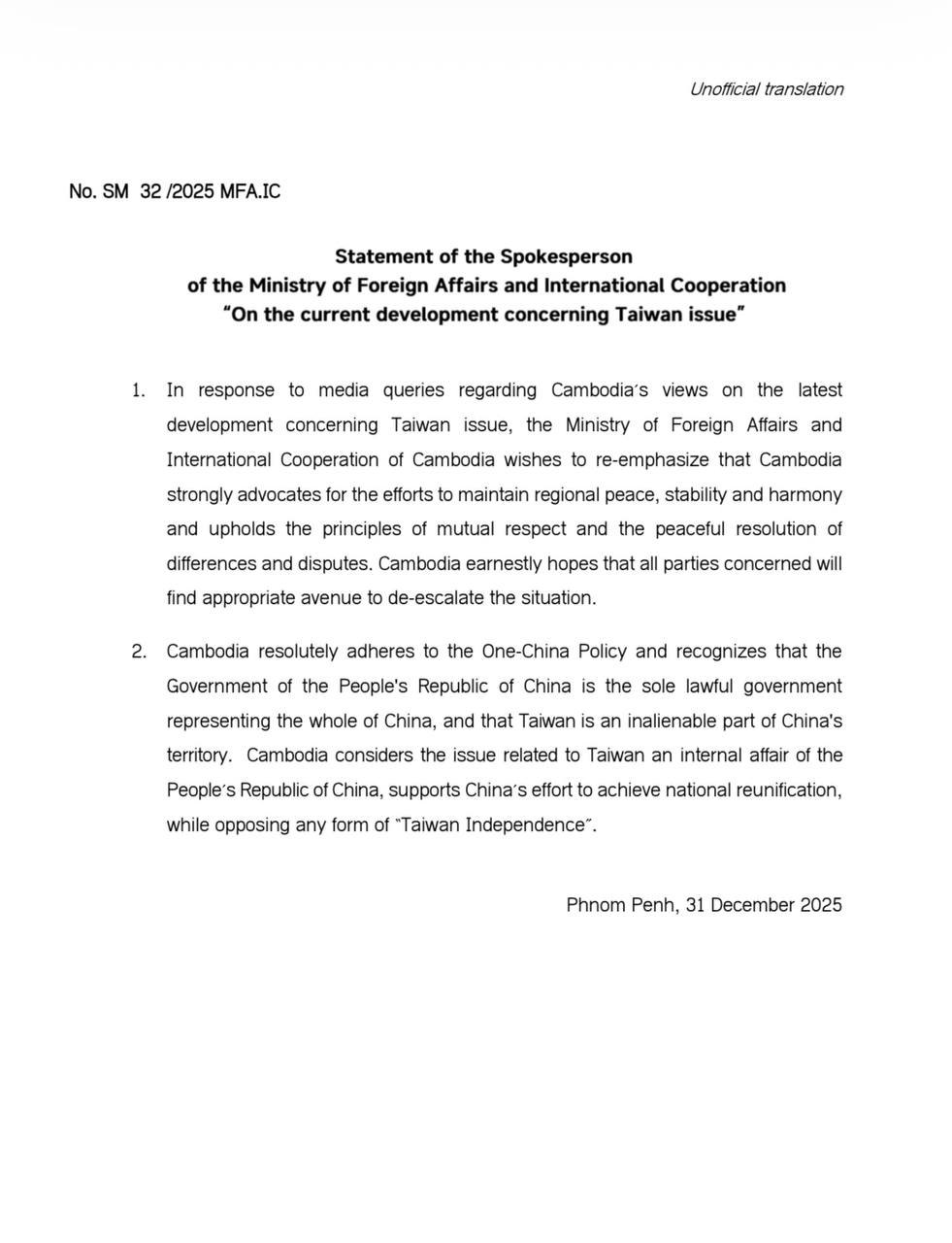 ជាមួយគ្នានេះ កម្ពុជាក៏បានបញ្ជាក់សាជាថ្មីអំពីការប្រកាន់ខ្ជាប់យ៉ាងម៉ឺងម៉ាត់នូវគោលនយោបាយ «ចិនមួយ» ដោយទទួលស្គាល់ថា រដ្ឋាភិបាលនៃសាធារណរដ្ឋប្រជាមានិតចិន គឺជារដ្ឋាភិបាលស្របច្បាប់តែមួយគត់ តំណាងឱ្យប្រទេសចិនទាំងមូល ហើយតៃវ៉ាន់ គឺជាផ្នែកមួយដែលមិនអាចកាត់ផ្តាច់បាននៃទឹកដីរបស់ប្រទេសចិន។