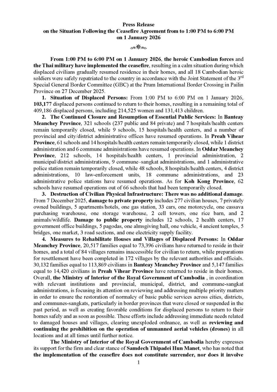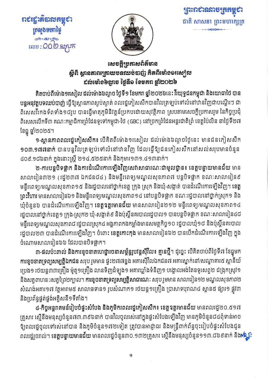យោងតាមសេចក្តីប្រកាសព័ត៌មានរបស់ក្រសួងមហាផ្ទៃស្តីពី ស្ថានភាពក្រោយបទឈប់បាញ់ គិតត្រឹមម៉ោង ០៦ ល្ងាច ថ្ងៃទី០៣ ខែមករា ឆ្នាំ២០២៦ បានបញ្ជាក់ថា ផលប៉ះពាល់ និងការខូចខាតហេដ្ឋារចនាសម្ព័ន្ធរូបវន្តស៊ីវិល គិតចាប់ពីថ្ងៃទី០៧ ខែធ្នូ ឆ្នាំ២០២៥មក ការខូចខាតទ្រព្យសម្បត្តិឯកជន សរុប រួមមាន ផ្ទះ ៣២៣ ខ្នង, អគារស៊ីវិលឯកជន ០៧, អគារស្នាក់នៅសណ្ឋាគារ ០៥, ស្ថានីយ៍ប្រេង ០៣, ផ្សារឯកជន ០១, រថយន្ត ៣៣គ្រឿង, ម៉ូតូ ០៥ គ្រឿង, លានទិញដំឡូង ០១, អគារឃ្លាំងទំនិញ ០១, បង្គោលអង់តែនទូរសព្ទ ០២, ជង្រុកស្រូវ ០១ និងសត្វពាហនៈ សត្វព្រៃ ០២ ក្បាល។