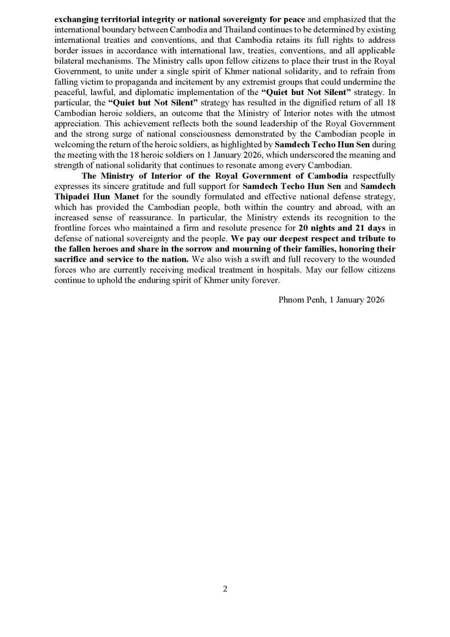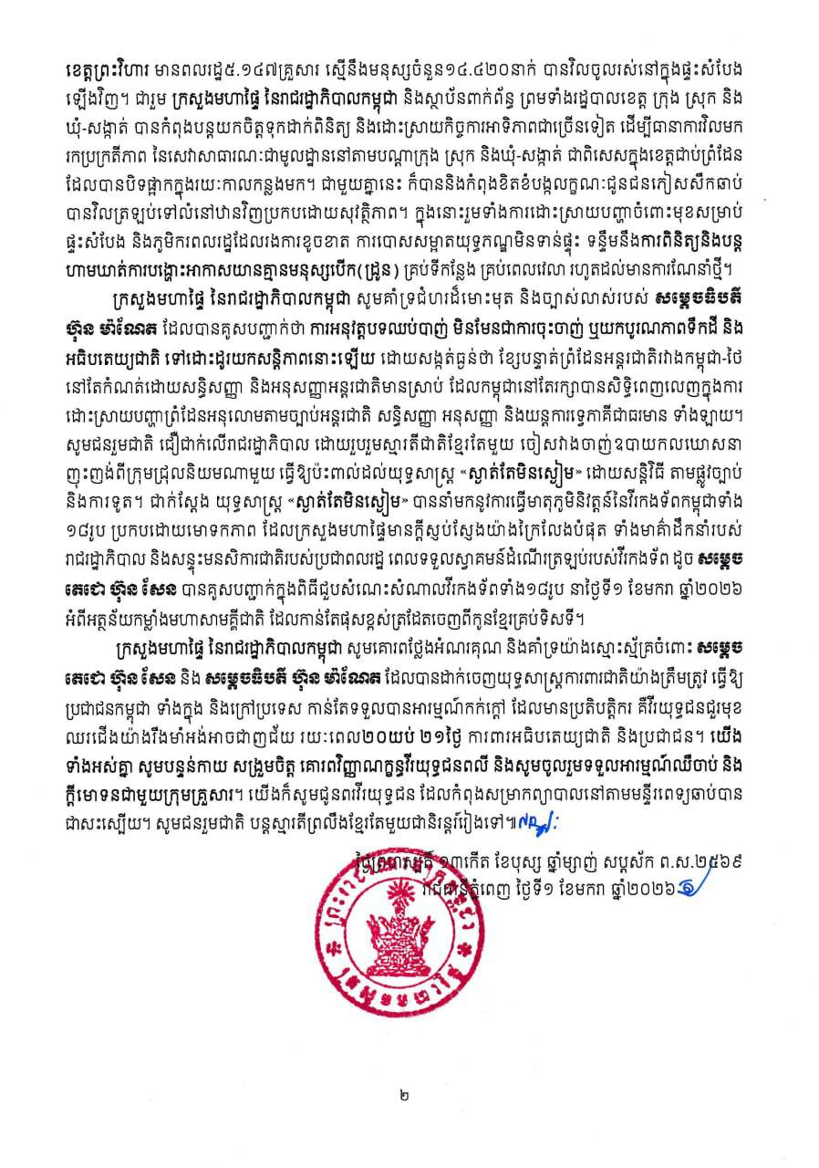 ក្រសួងមហាផ្ទៃ បានបញ្ជាក់ថា កំពុងប្រមូលព័ត៌មាន និងភស្តុតាងពាក់ព័ន្ធ ដើម្បីចាត់វិធានការតាមផ្លូវច្បាប់ និងរាយការណ៍ទៅស្ថាប័នពាក់ព័ន្ធជាតិ និងអន្តរជាតិ។ ជាមួយគ្នានេះផងដែរ អាជ្ញាធរកម្ពុជា បានអំពាវនាវឲ្យភាគីពាក់ព័ន្ធគោរពច្បាប់អន្តរជាតិ និងបញ្ឈប់រាល់សកម្មភាពណាដែលប៉ះពាល់ដល់សុវត្ថិភាព និងសិទ្ធិប្រជាពលរដ្ឋស៊ីវិល៕
