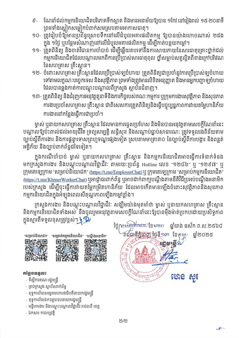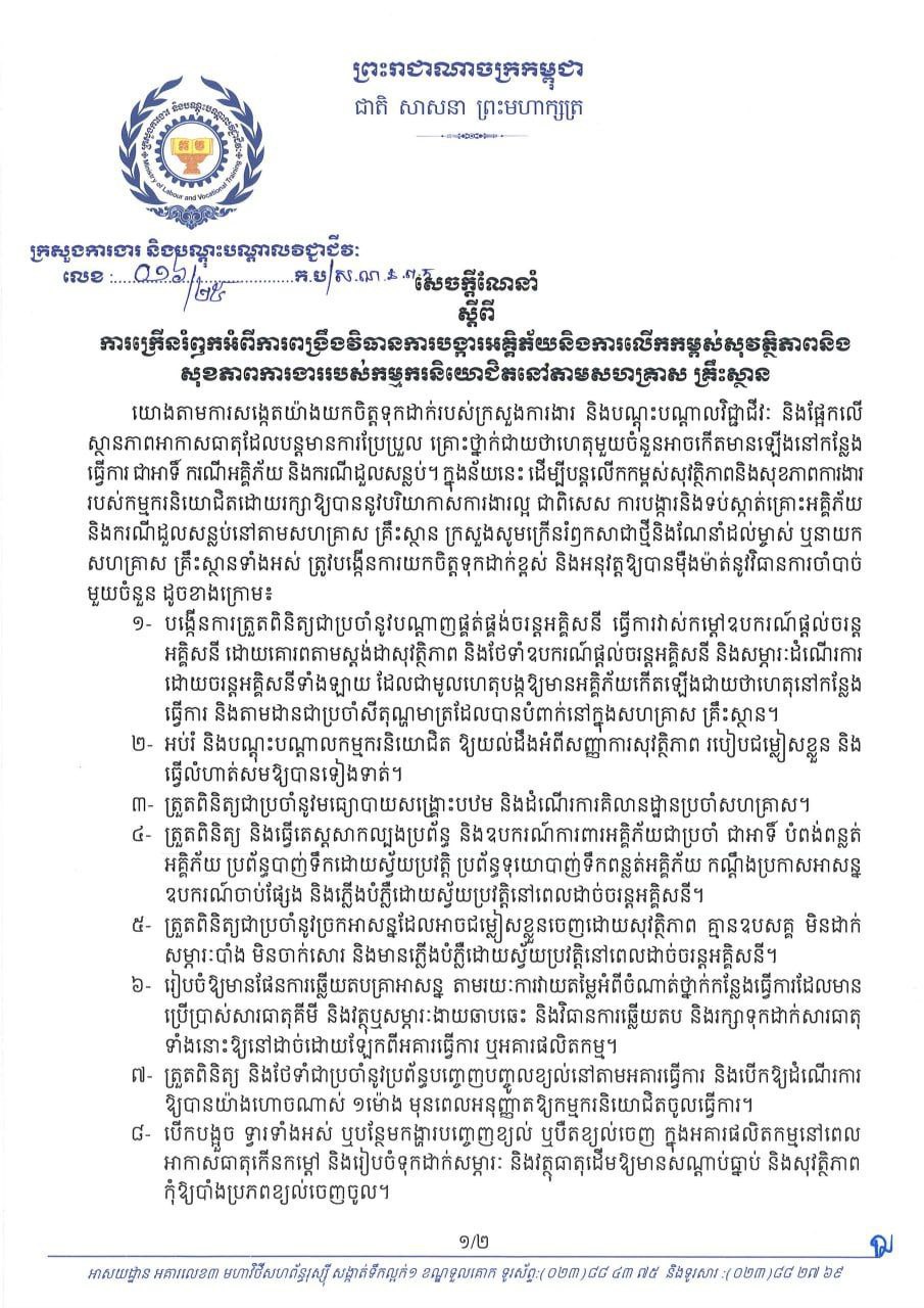 យោងតាមសេចក្តីណែនាំរបស់ក្រសួងការងារនិងបណ្តុះបណ្តាលវិជ្ជាជីវៈ ចុះផ្សាយថ្ងៃទី១៣ ខែកុម្ភៈ ឆ្នាំ២០២៥ បានក្រើនរំលឹកដល់ ម្ចាស់ ឬនាយកសហគ្រាស គ្រឹះស្ថានទាំងអស់ ត្រូវរៀបចំឱ្យមានផែនការឆ្លើយតបពេលអាសន្នឱ្យបានរហ័ស ចំពោះទីតាំងដែលប្រើប្រាស់សារធាតុគីមី និងវត្ថុ ឬសម្ភារៈដែលងាយឆាបឆេះ និងធ្វើការតាមដានជាប្រចាំលើសីតុណ្ហភាពសមាមាត្រ ដែលបានបំពាក់ក្នុងសហគ្រាស និងគ្រឹះស្ថាន ពិនិត្យនិងថែទាំជាប្រចាំនូវប្រព័ន្ធបញ្ចេញបញ្ចូលខ្យល់ បើកទ្វារ បង្អួចទាំងអស់ កម្មករនិយោជិតត្រូវស្លៀកសម្លៀកបំពាក់សមស្របតាមអាកាសធាតុ។