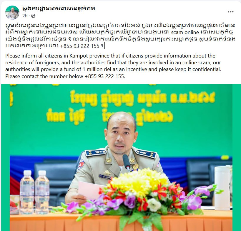 កំពត៖ ស្នងការនគរបាលខេត្តកំពត បានប្រកាសនៅថ្ងៃទី១៤ ខែកុម្ភៈនេះ អំពីការផ្តល់ថវិកា ចំនួន ១ លានរៀល ជារង្វាន់លើកទឹកចិត្ត ដល់ប្រជាពលរដ្ឋណាដែលផ្តល់ព័ត៌មាន ពាក់ព័ន្ធនឹងករណីឆបោកតាមអនឡាញ (scam online) នៅក្នុងភូមិសាស្ត្រខេត្ត។