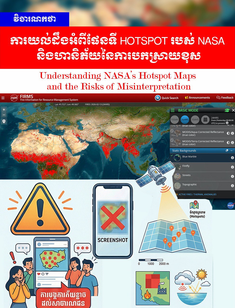 ប្រព័ន្ធព័ត៌មានអំពីអគ្គិភ័យសម្រាប់ការគ្រប់គ្រងធនធាន (Fire Information for Resource Management System-FIRMS) របស់ NASA គឺជាឧបករណ៍ដ៏មានឥទ្ធិពល ប៉ុន្តែវាជារឿយៗត្រូវបានសាធារណជនយល់ច្រឡំថាជា "ផែនទីភ្លើងឆេះពិតប្រាកដ"។